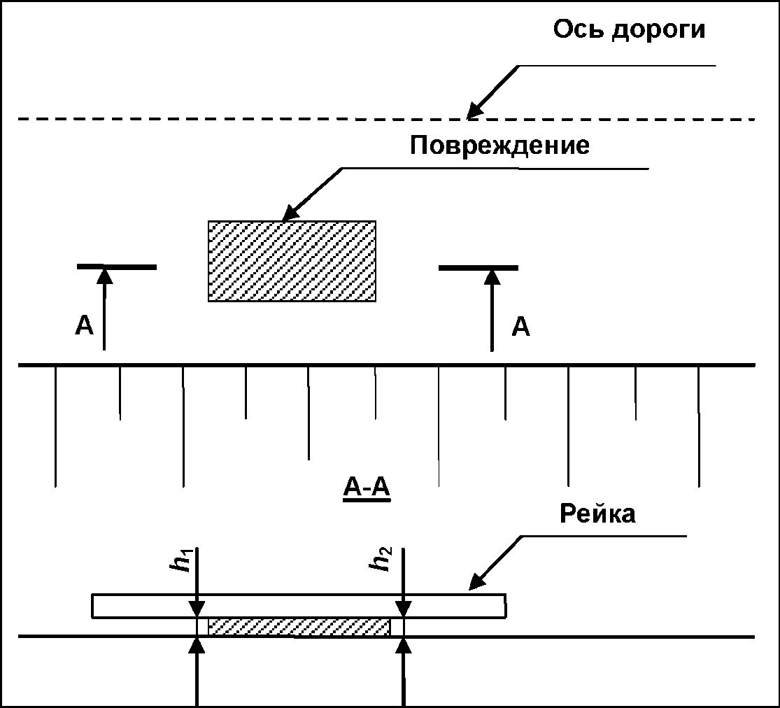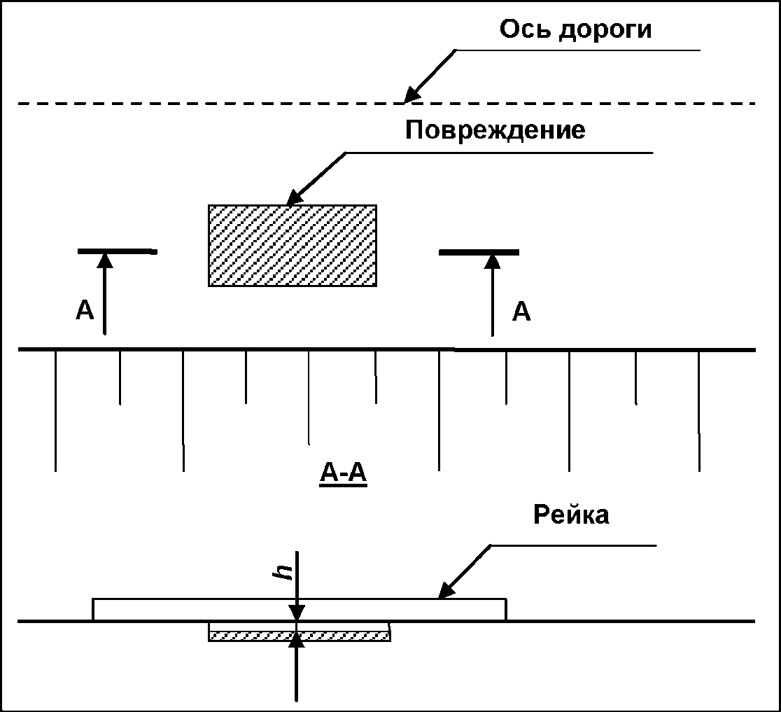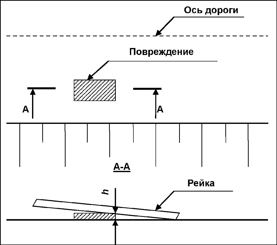 Сущность метода заключается в измерении протяженности повреждения в направлении, параллельном оси автомобильной дороги, и измерении клиновым промерником или металлической линейкой максимального просвета под трехметровой рейкой, уложенной на дорожное покрытие в направлении, параллельном оси автомобильной дороги.