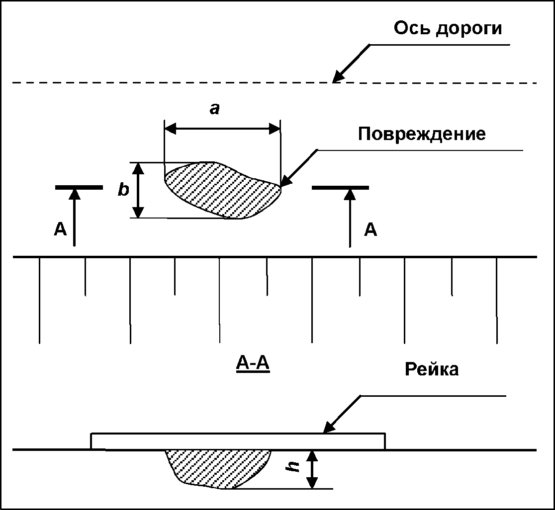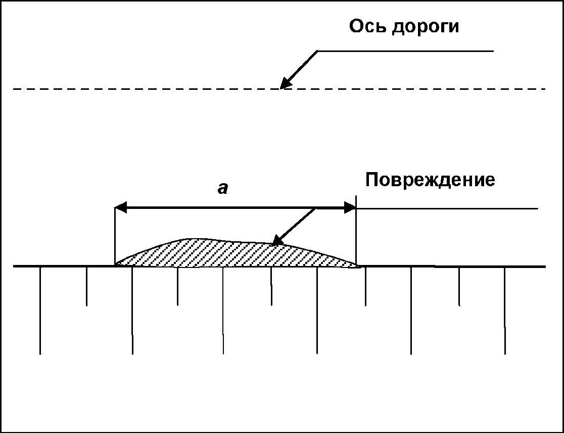 где a - максимальный размер повреждения, измеренный в направлении, параллельном оси автомобильной дороги, см;