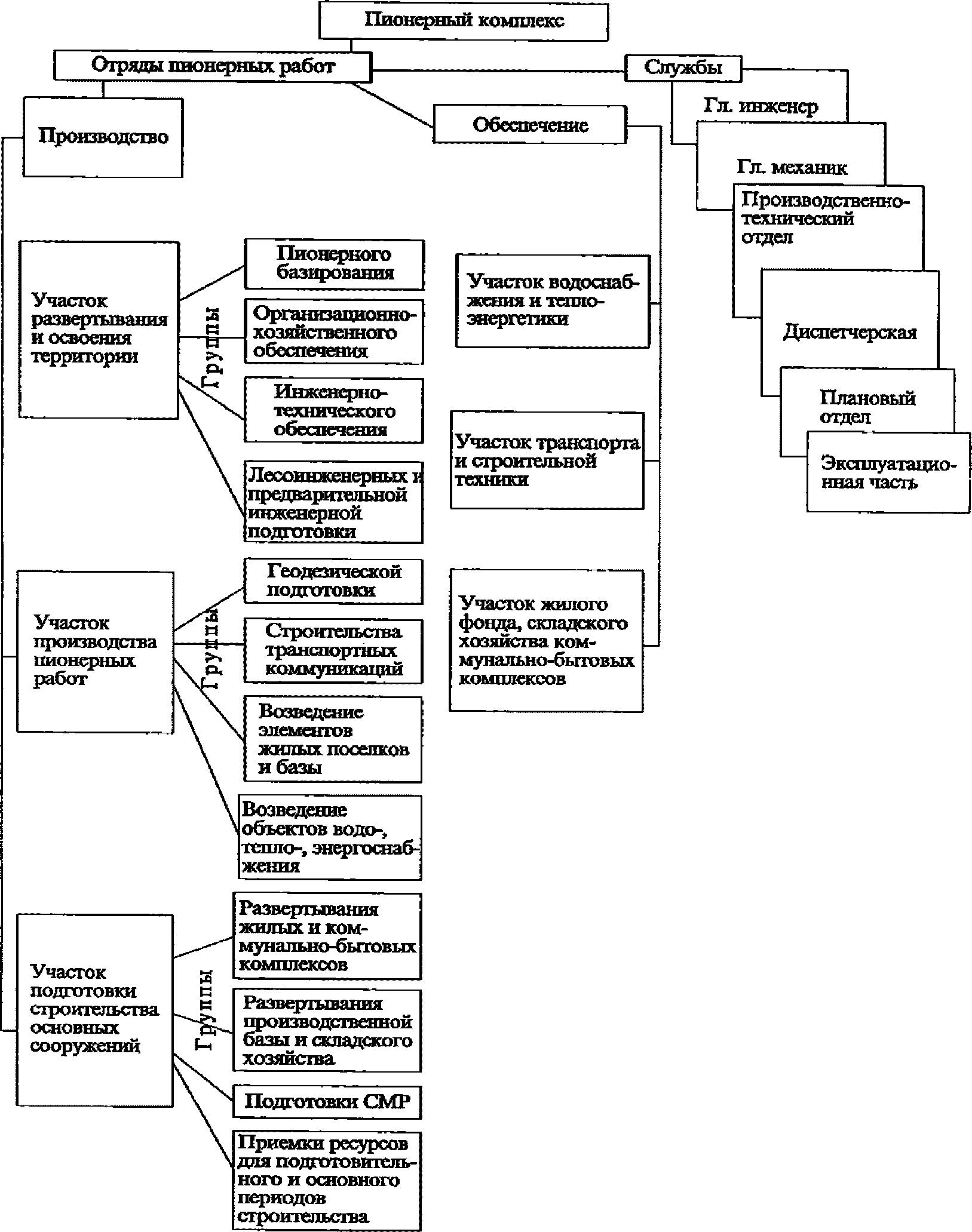 - изложены состав работ и комплекс организационно-хозяйственных и инженерно-технических мероприятий по жизнеобеспечению при пионерном освоении территории с раскрытием организационной структуры пионерного комплекса, включающей подразделения по производству работ и инженерному обеспечению, в том числе жилищно-коммунальному и социально-бытовому обслуживанию;