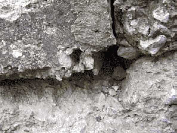 Сочетание температуры, влажности и состава воздуха, благоприятствующее коррозии | экспозиция арматуры в результате разрушения защитного слоя | уменьшение площади поперечного сечения арматуры |