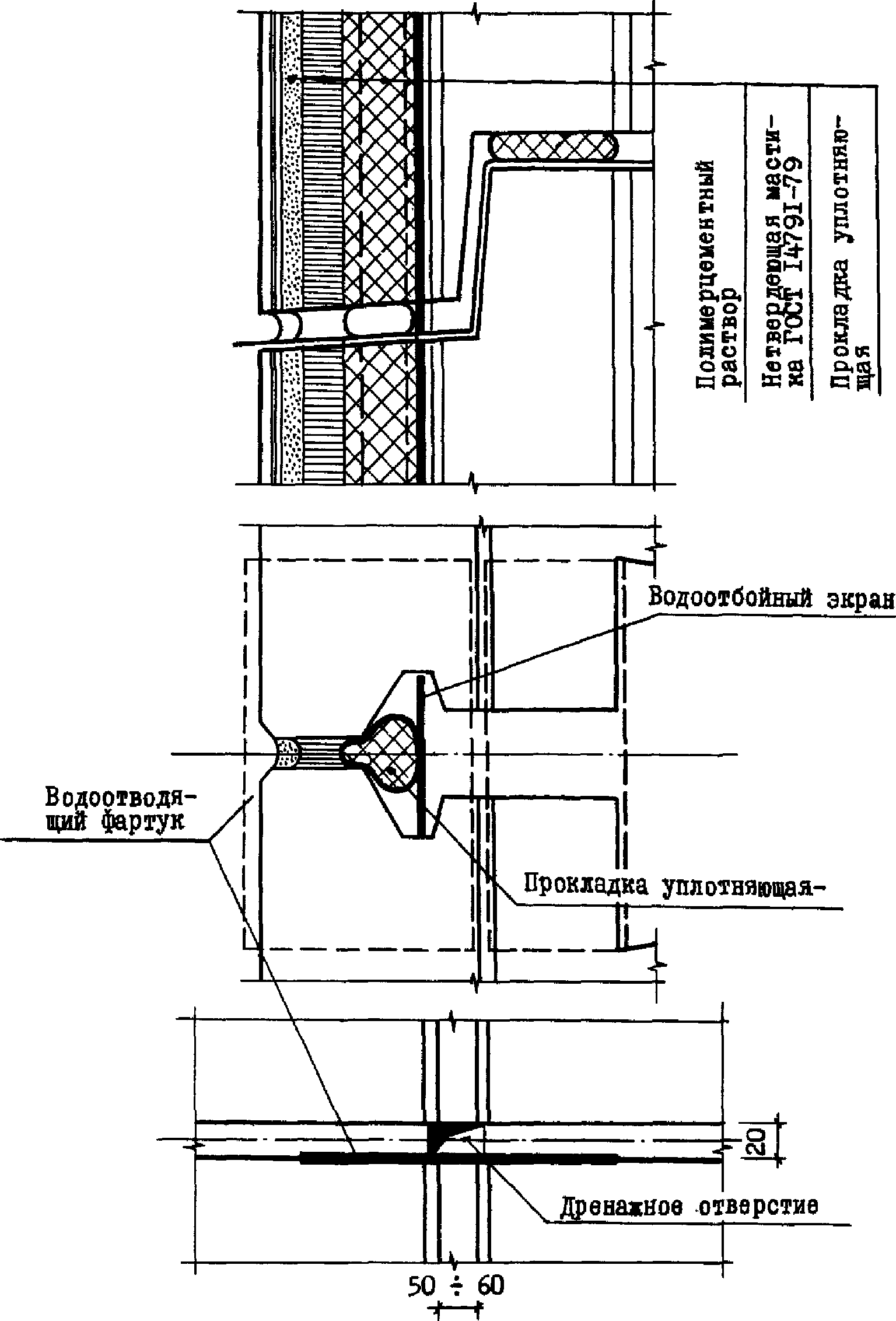 Резиновый лист, ГОСТ 7338-77 | Лист из атмосферостойкой резины толщиной 1,5 - 2 мм | Водоотводящий фартук в стыках открытого и дренированного типов | Размеры 220 x 220 мм | Ленинградское производственное объединение "Красный треугольник" | Наклеивается на клеях типа КН на верхние грани панелей в местах пересечения вертикального и горизонтального стыков |