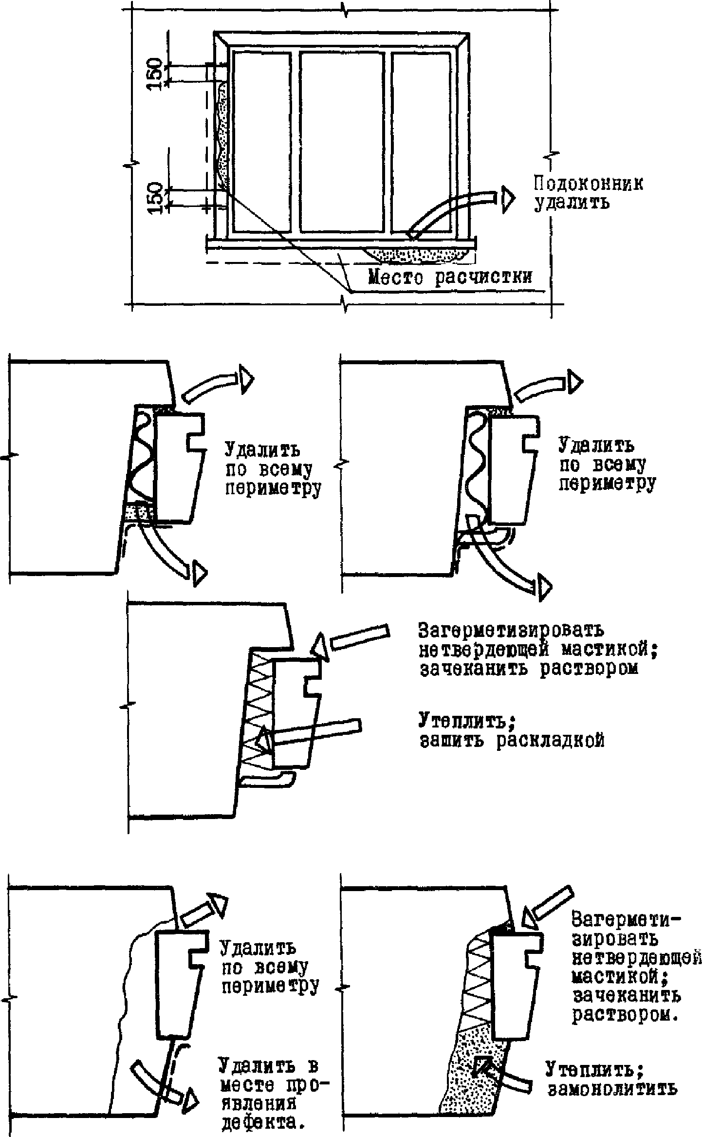 Основные ремонтные операции следующие: подготовка ремонтируемых стыков, восстановление целостности элементов стыков и фасадов, устройство дополнительной изоляции стыков, ремонтно-восстановительная герметизация стыков, ремонт мест примыкания оконных (дверных) заполнений к граням проемов.