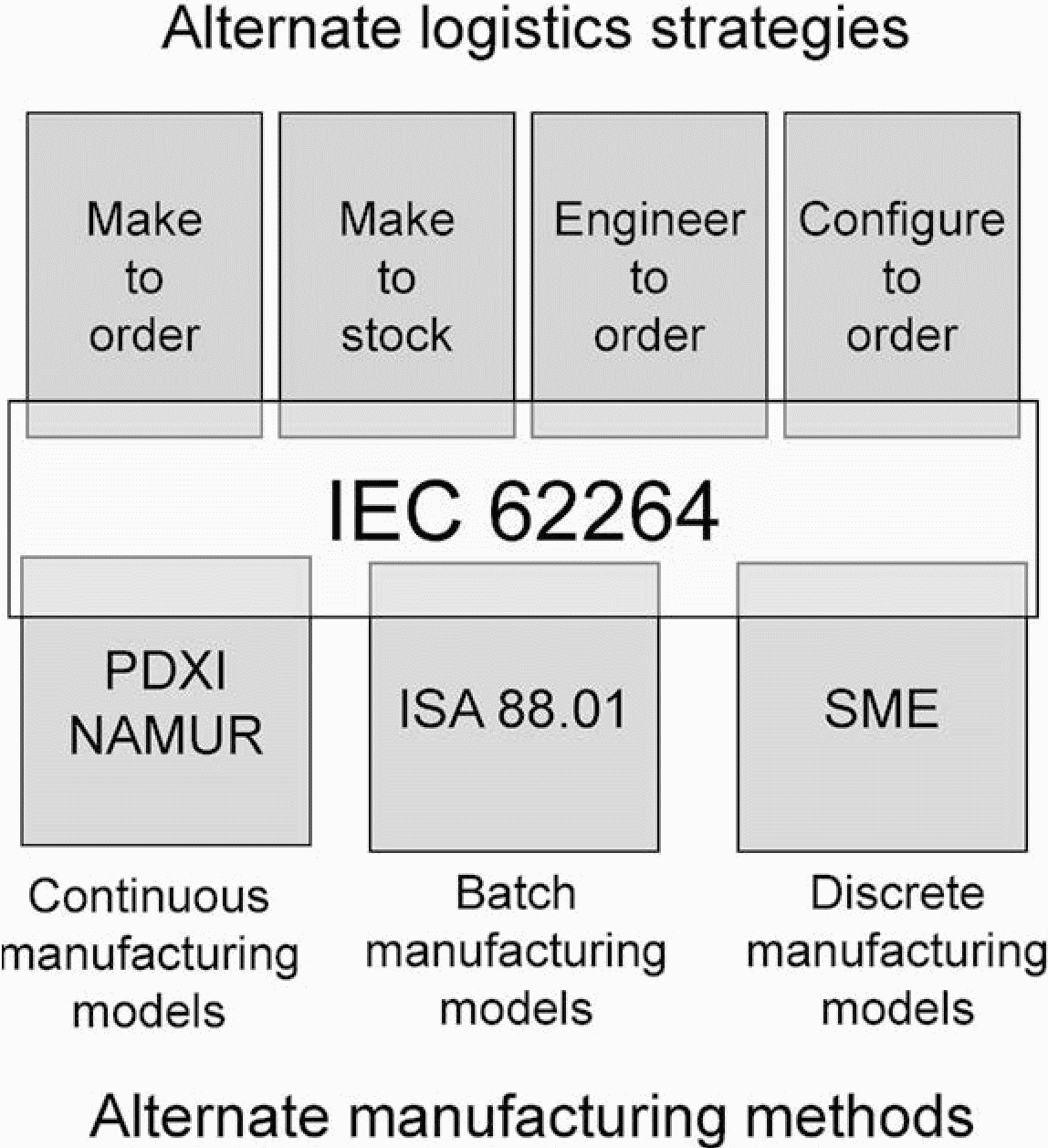 Комплекс стандартов МЭК 62264 состоит из нескольких частей и определяет интерфейсы между функциями предприятия и управляющими воздействиями. В настоящем стандарте приведены стандартные модели и терминология, необходимые для описания интерфейсов между производственными системами предприятия и системами управления технологическими процессами. Модели и терминология, представленные в настоящем стандарте, служат следующим целям: