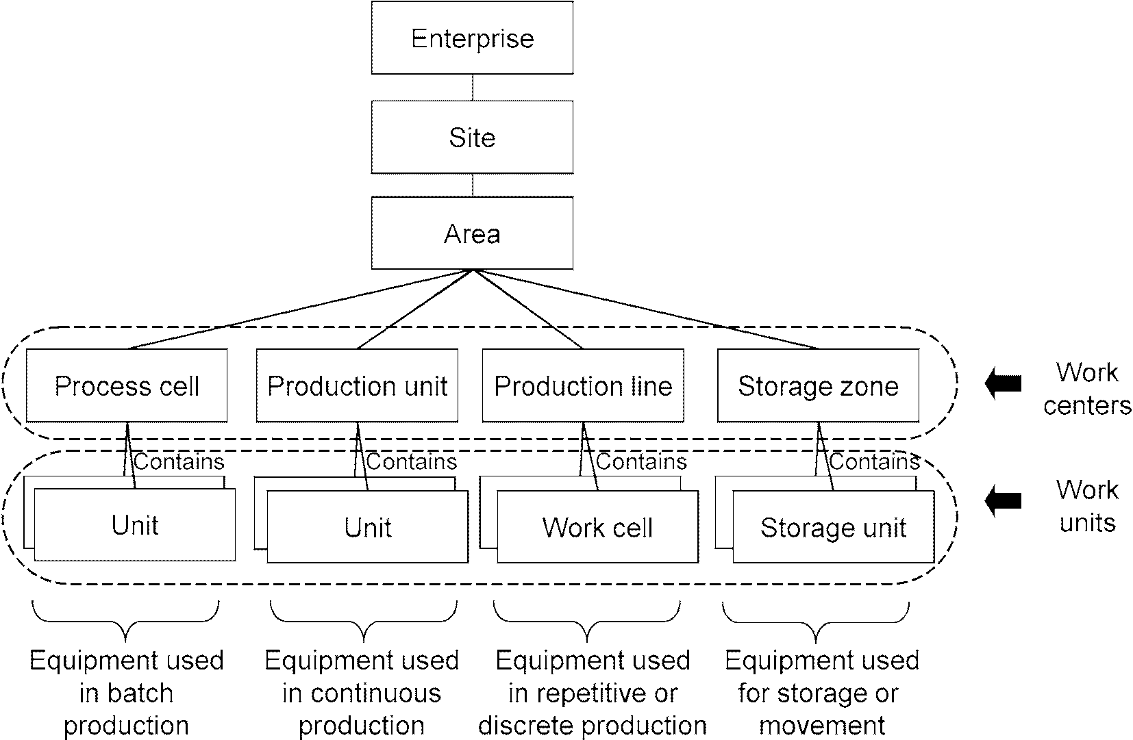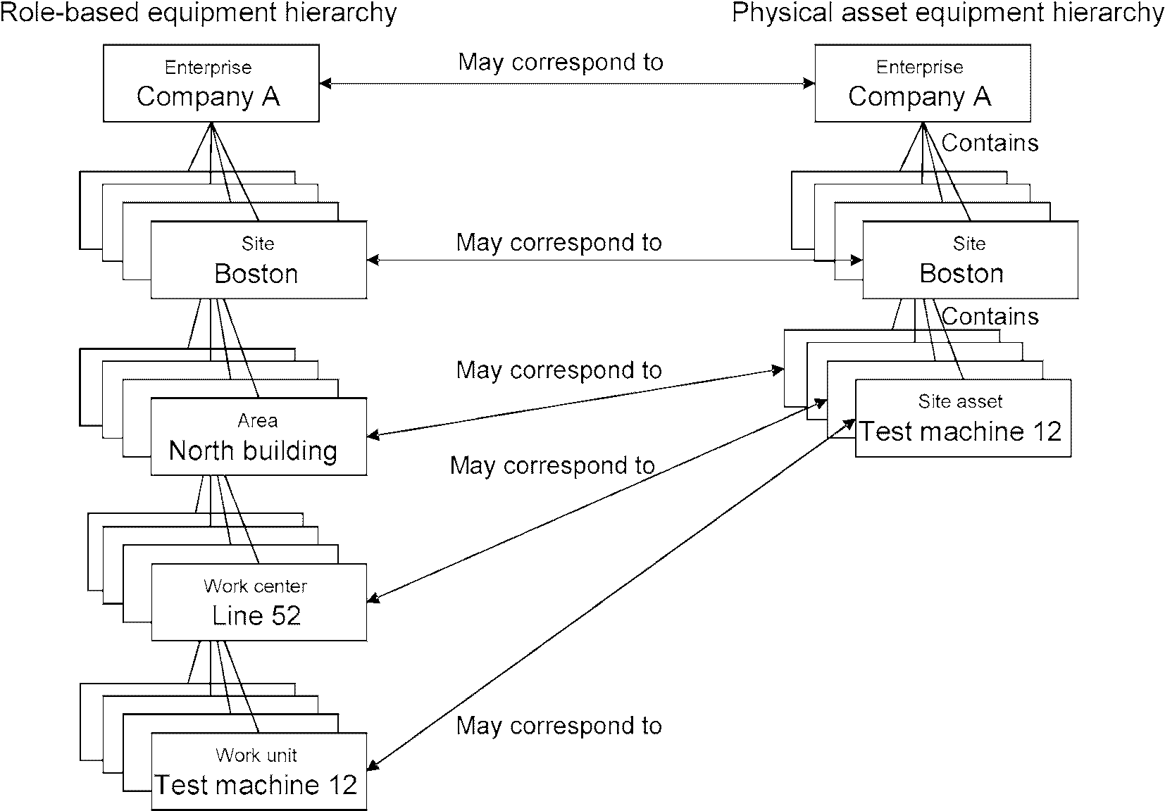 Описанная в МЭК 61512 иерархия оборудования - это сочетание оборудования и управления, однако оборудование обычно идентифицируют по его назначению (например, по кодовой метке), поэтому она аналогична ролевой иерархии оборудования, описанной в МЭК 62264. Иерархия материальных активов в МЭК 62264 идентифицируют по реальному оборудованию (например, по его серийному номеру).
