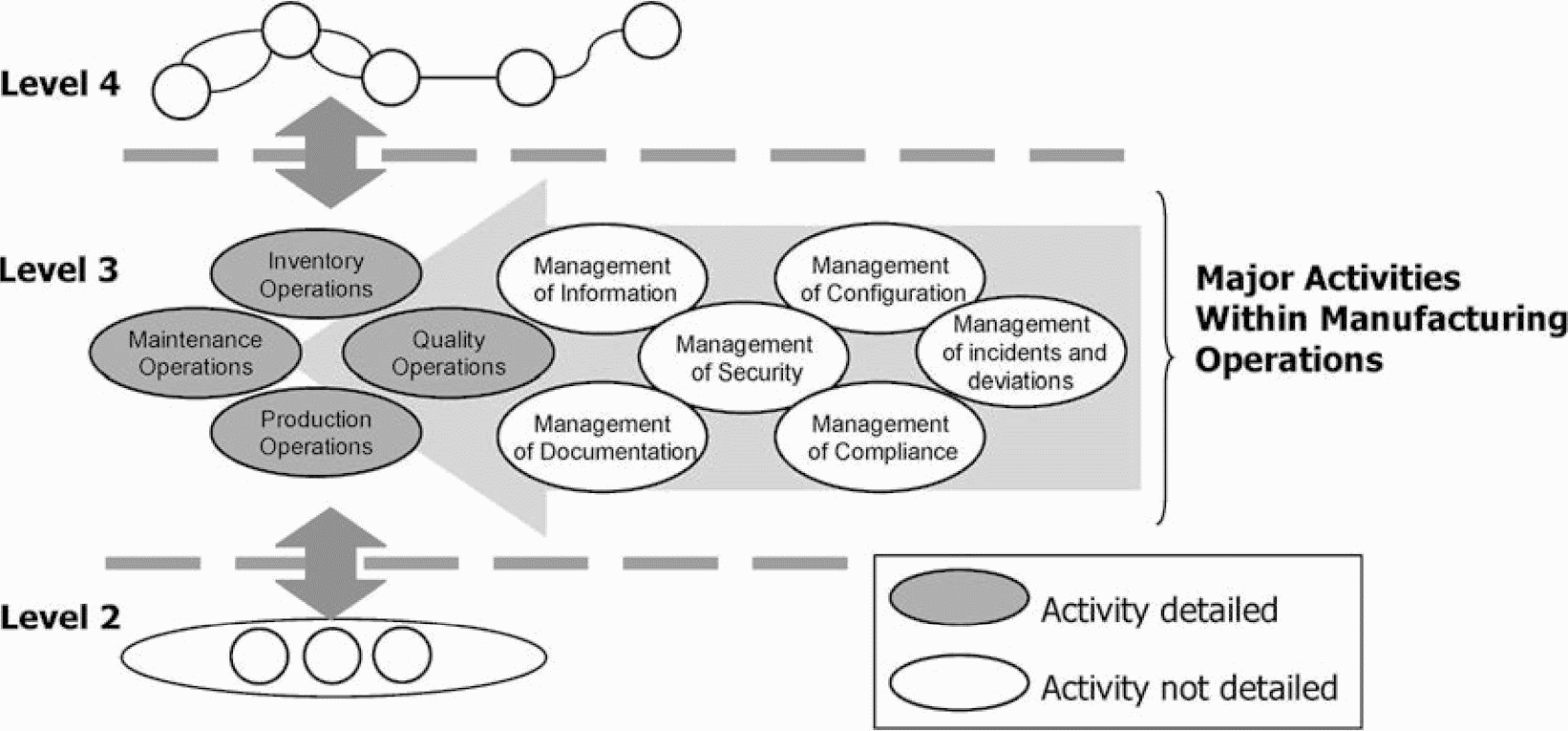 Настоящий стандарт распространяется на принципы организации интерфейсов между функциями управления технологическими процессами и другими функциями предприятия. В настоящем стандарте установлено описание домена управления производственными процессами (уровень 3) и их видов деятельности, а также интерфейс взаимодействия и связанные с ними операции уровня 3 и между уровнями 3 и 4. Подобное описание позволяет производить объединение доменов производственных процессов и управления (уровни 3, 2, 1) с доменом предприятия (уровень 4). Интерфейс взаимодействия между уровнями 3 и 2 рассмотрен достаточно кратко.