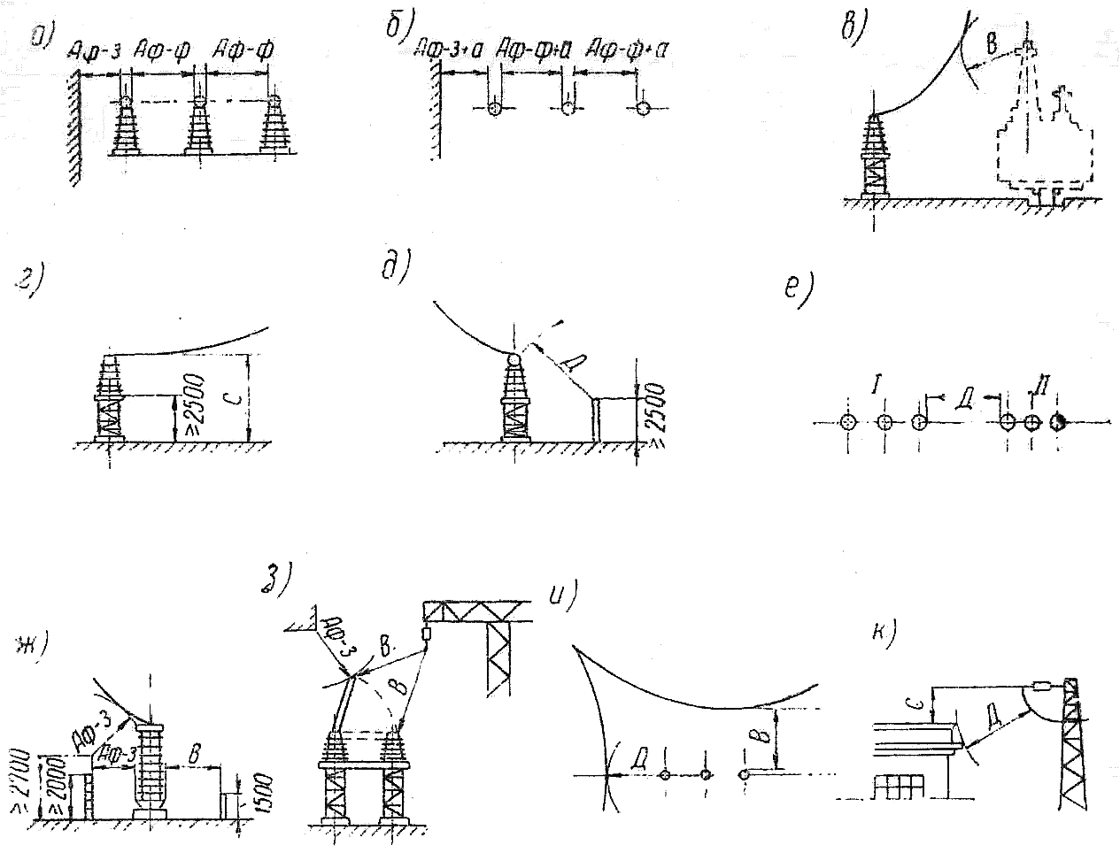 От токоведущих частей до заземленных конструкций и частей зданий Аф-з | 65 | 90 | 120 | 180 | 290 | 900 |