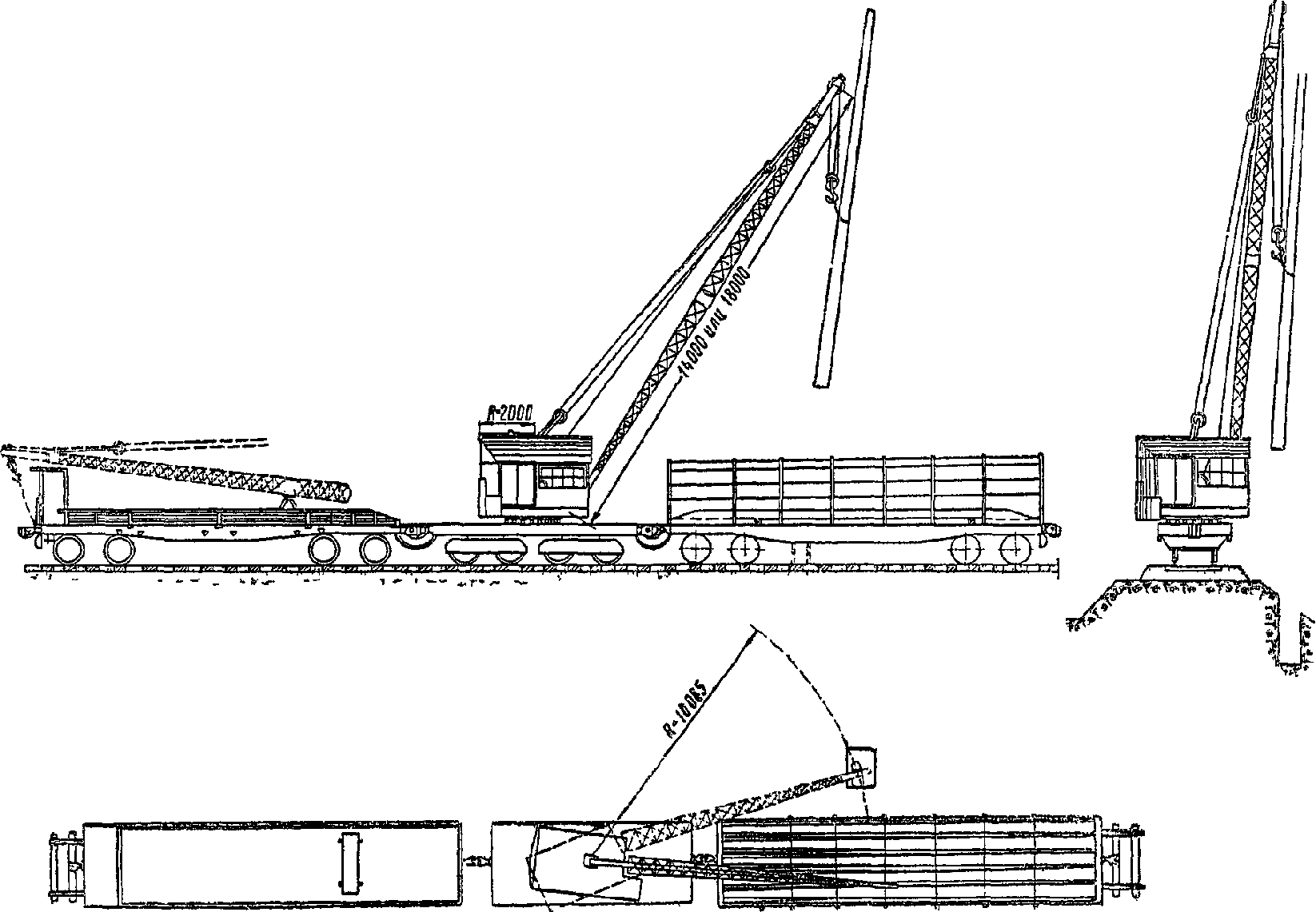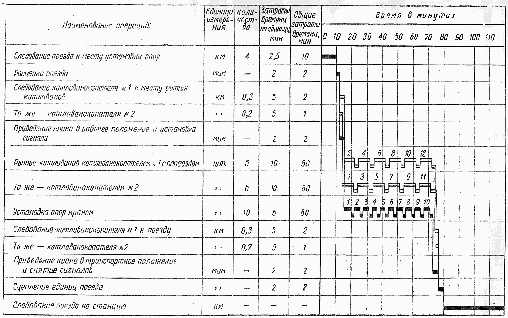 а) разработка котлованов (или погружение свайных фундаментов), перевозка и установка опор - комплектом механизмов, работающих с железнодорожного пути;