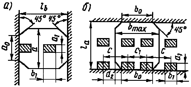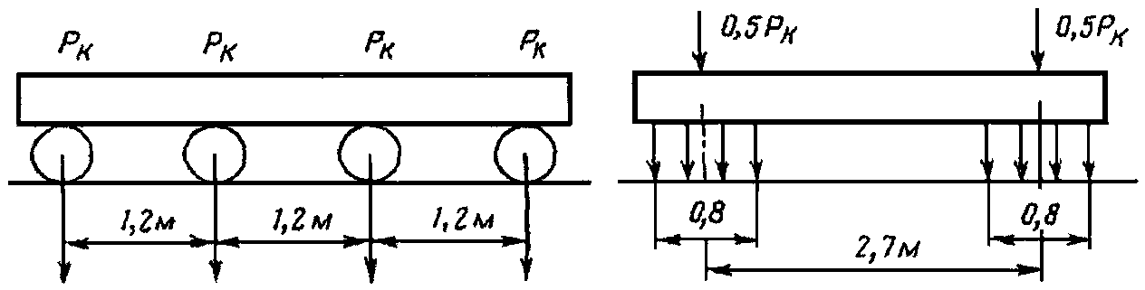 Грузоподъемность для тяжелой одиночной нагрузки принимают в виде массы эталонной четырехосной тележки с расстоянием между осями 1,2 м (рис. 2).
