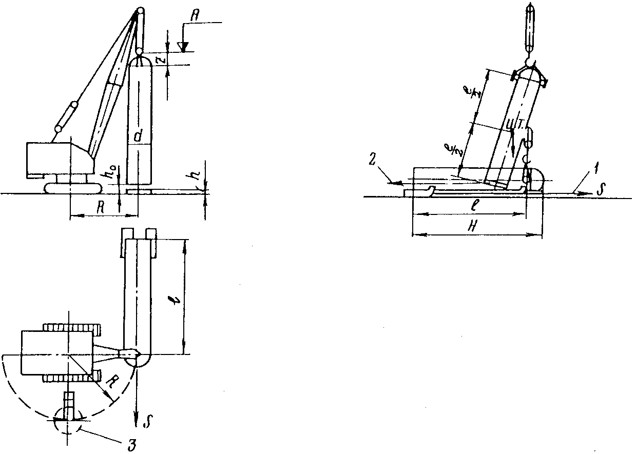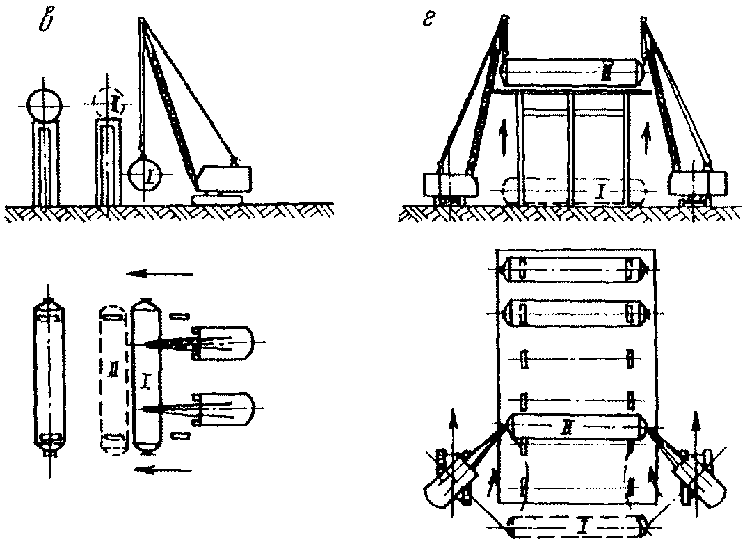 2.2. В Указаниях приведены схемы монтажа вертикального оборудования при помощи одиночных и спаренных кранов со скольжением низа аппарата по основанию (методом скольжения) и поворотом вокруг шарнира (метод поворота), а также схемы монтажа горизонтальных аппаратов.