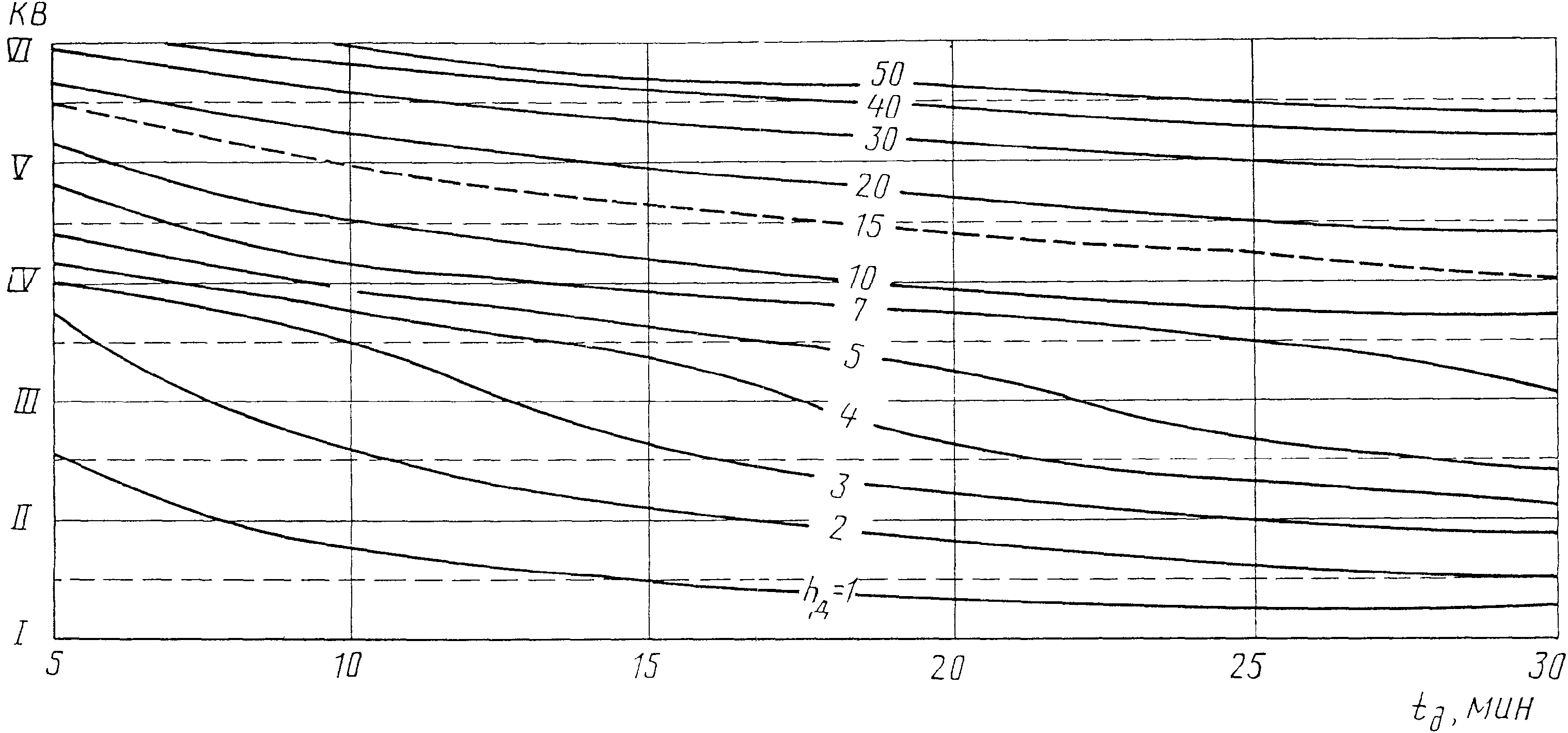 Используя график типовых лекал кривых зависимостей интенсивности выпадения ливневых осадков от их продолжительности (см.