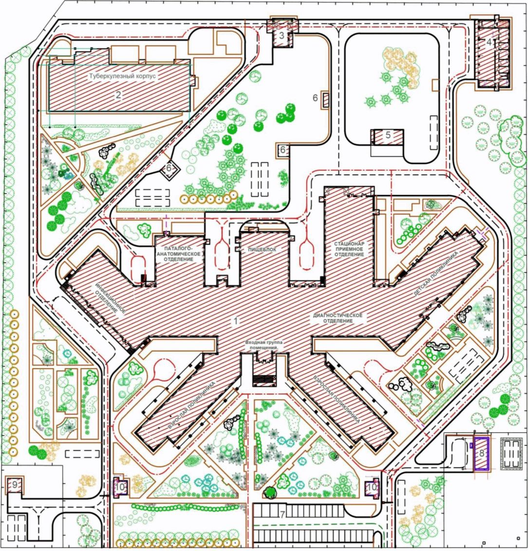 Данное размещение входной зоны учитывает направление основных потоков пешеходного движения и радиусов доступности. Приближение входов в поликлиники к входным зонам на участок (при проектировании многофункциональных комплексов) исключает возможность пересечения потоков пациентов и сотрудников разных отделений. Примеры генеральных планов медицинских организаций приведены на