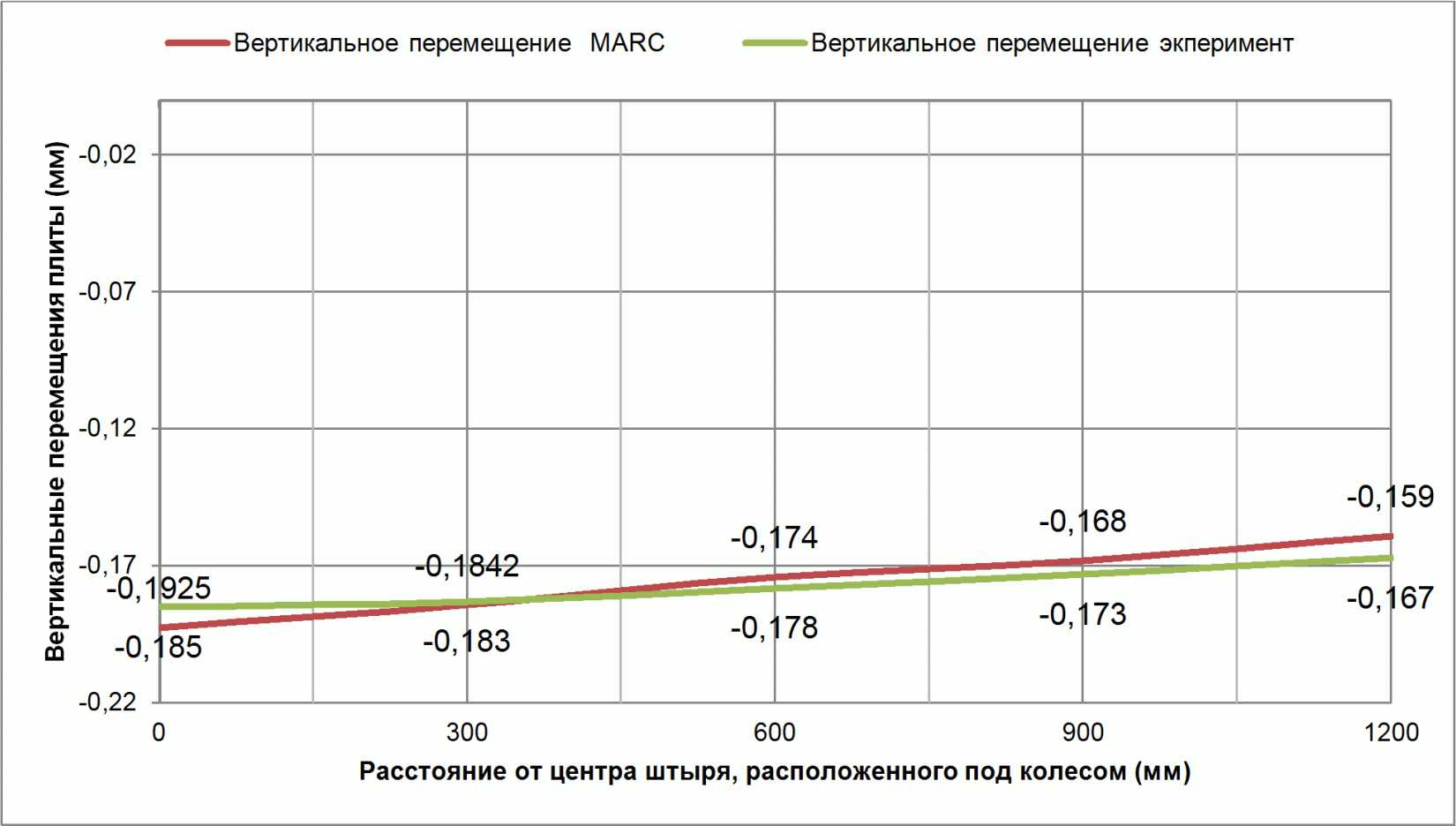 Нагрузка в середине плиты с отпечатком одного из колес на краю плиты (рисунок 3) | Vmax, мм | 2.116 | 2.125 | 2.119 |