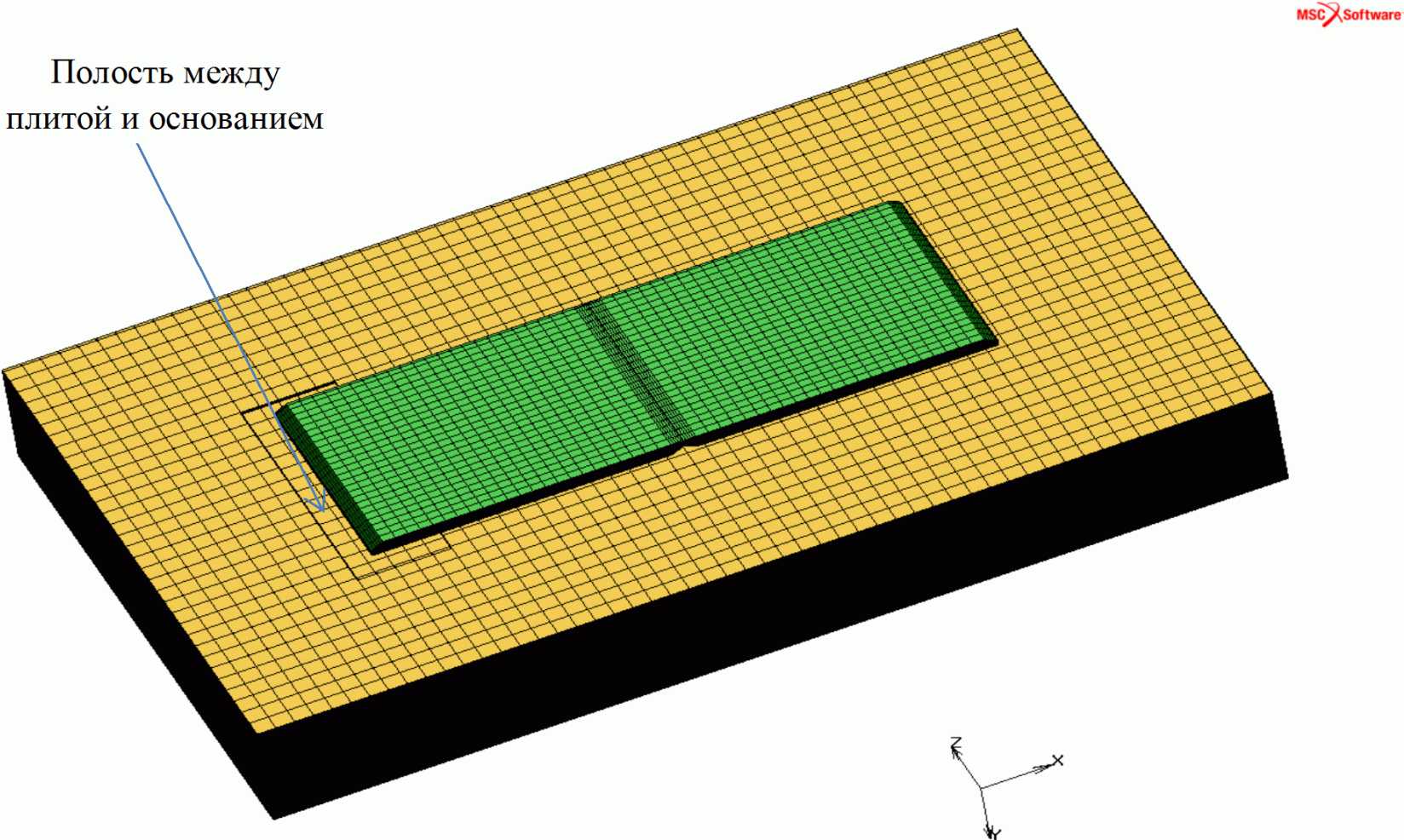 При выборе размеров расчетной области грунта в горизонтальном направлении было принято во внимание быстрое затухание деформаций и усилий в грунте по мере удаления от места приложения нагрузки. Расстояние от краев плиты до краев грунтового массива было принято равным 1 м. При этом, чтобы компенсировать влияние удаленного грунтового массива на рассматриваемую модель, на ее боковых гранях смоделировано основание Винклера. Таким образом, размеры грунтового основания получились равными вдоль осей X, Y и Z соответственно 7,0, 2,0 и 5,75 м (рисунок 1).