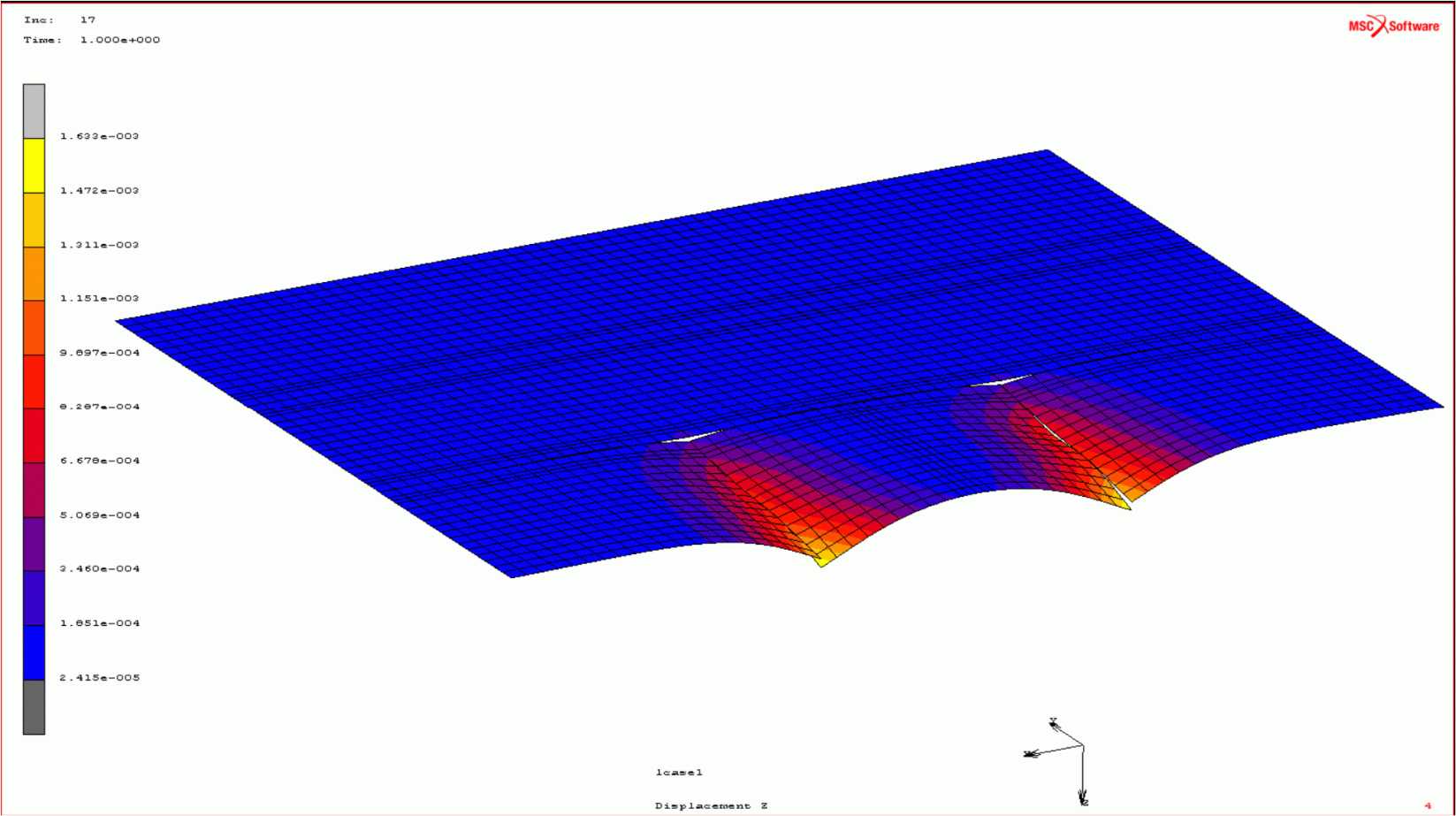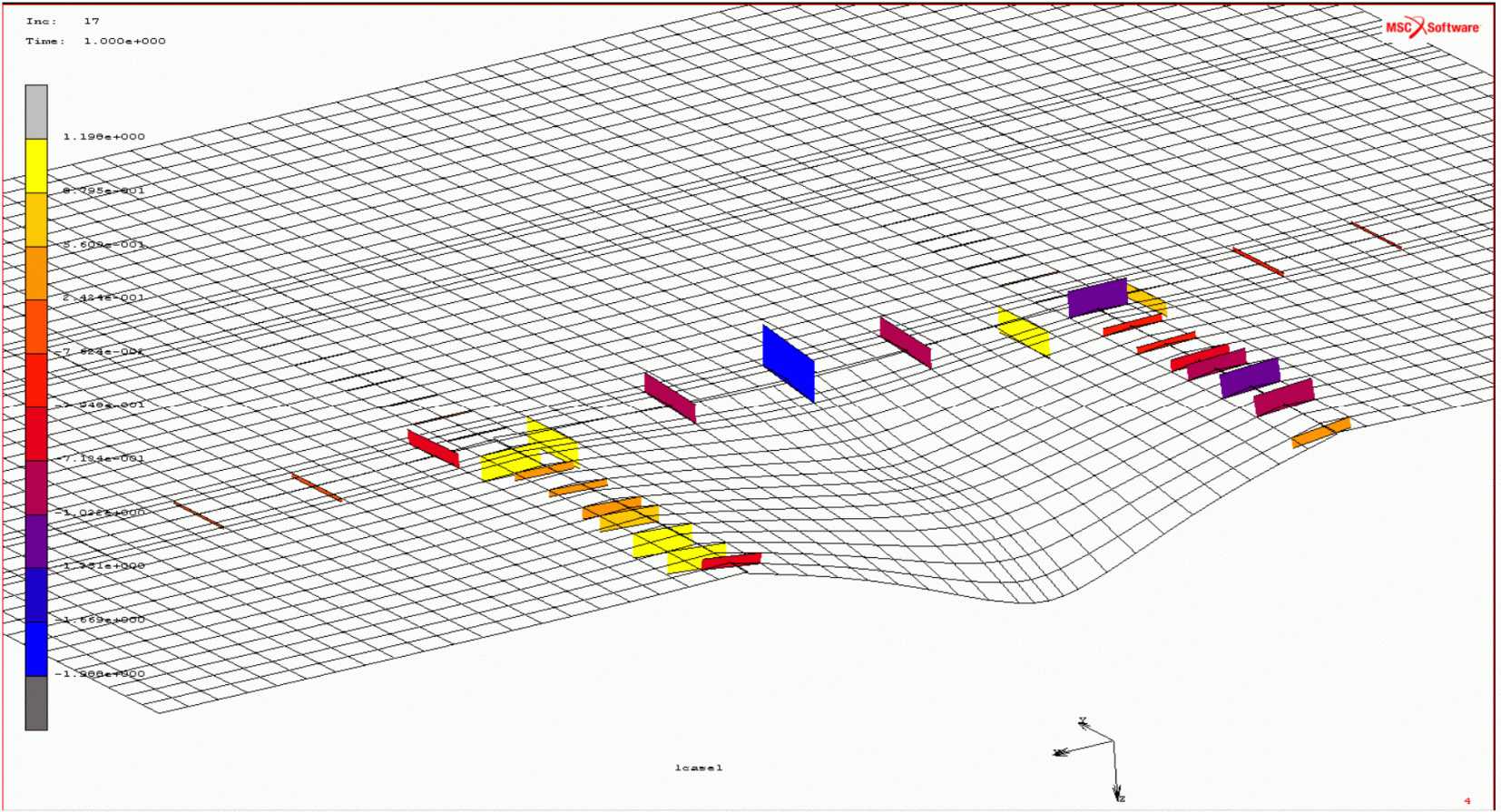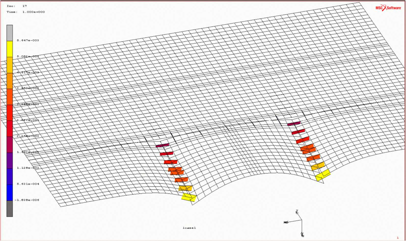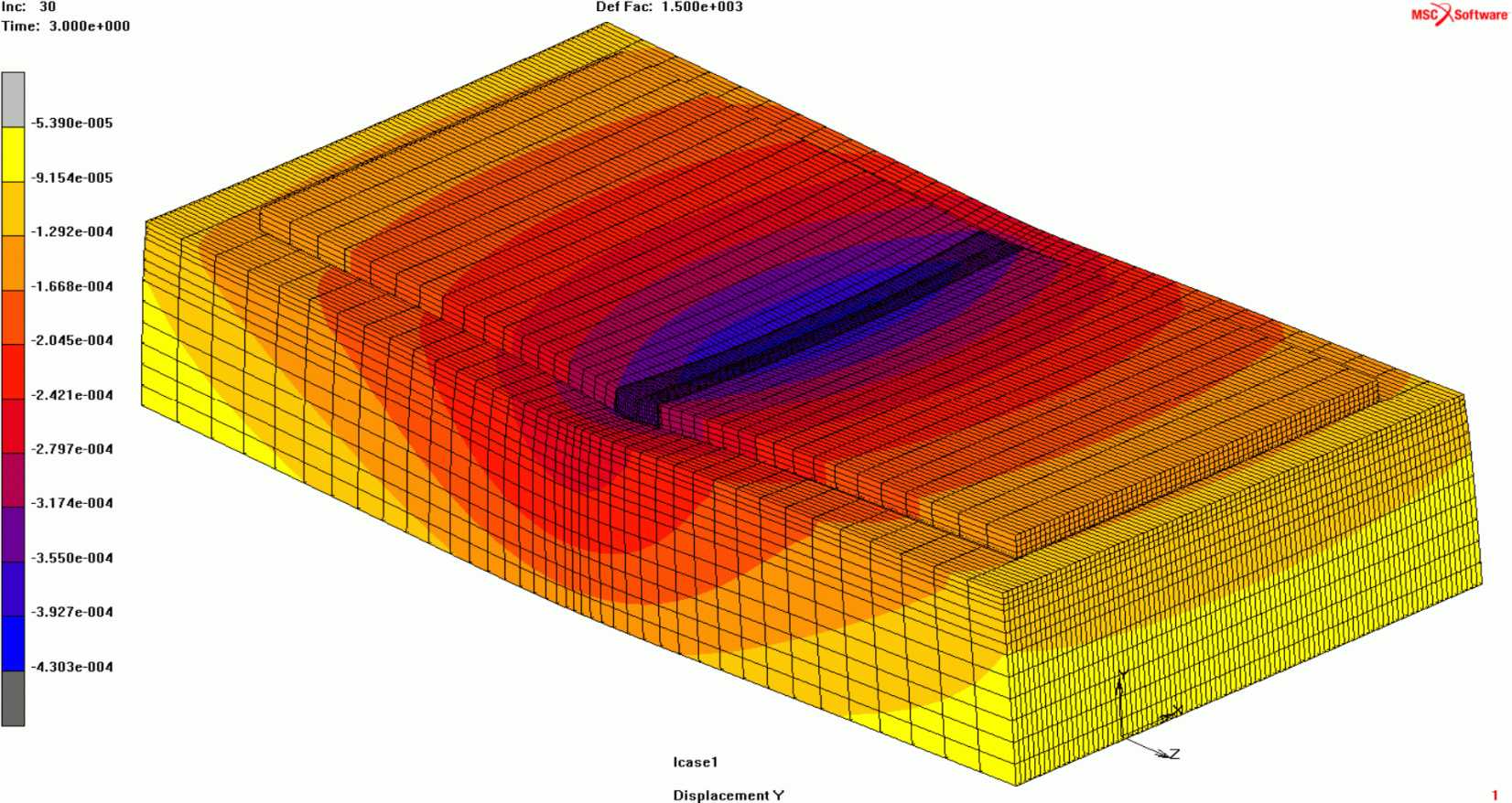 1. В случае моделирования плит многополосного жесткого дорожного покрытия объемными 8-узловыми конечными элементами размерность задачи становится недопустимо большой и недоступной для решения на обычном персональном компьютере. Поэтому такие задачи следует решать используя для создания конечно-элементной модели покрытия плоские 4-узловые конечные элементы типа "shell".