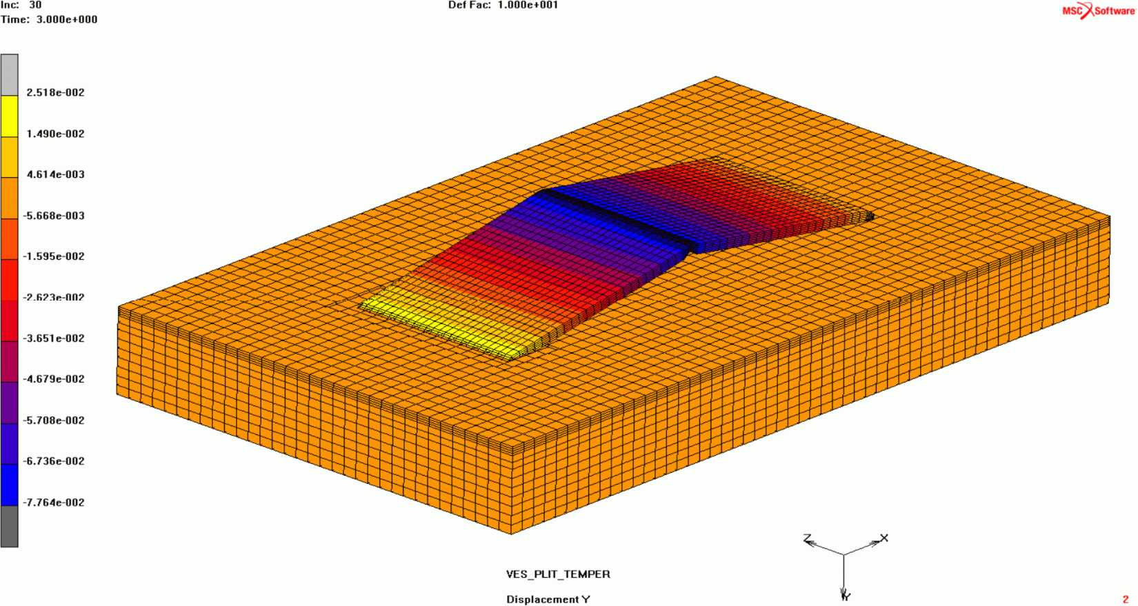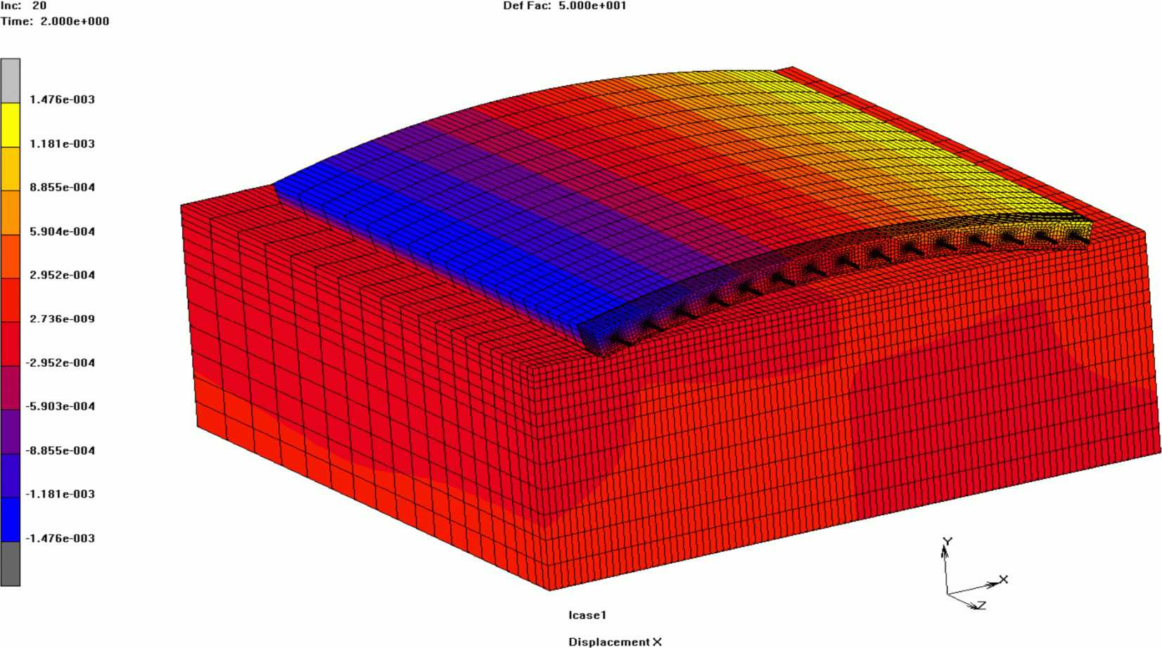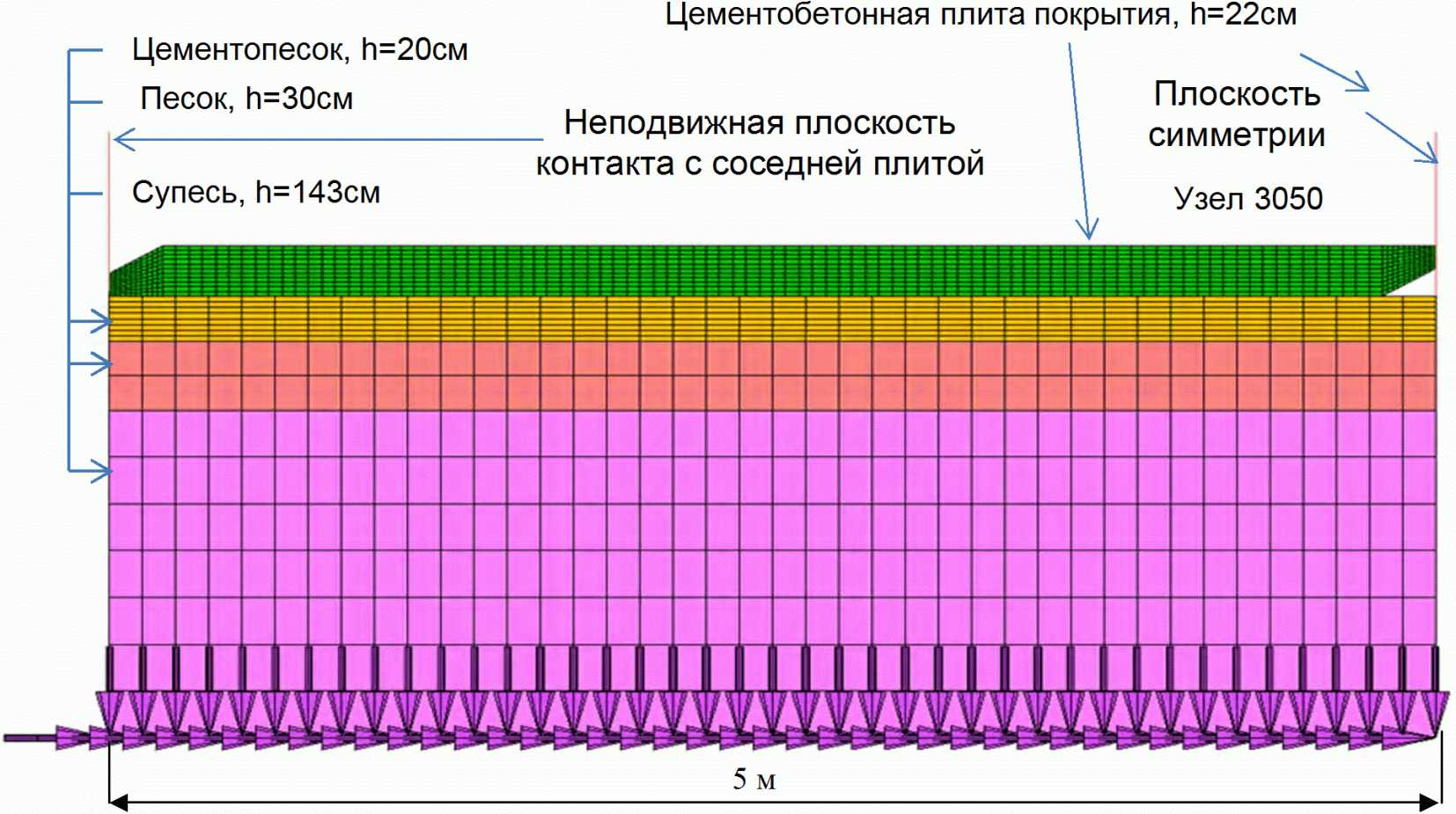 Дорожные одежды являются сложной многослойной композитной конструкцией, включающей в себя слои материалов различной толщины, свойства которых могут быть как линейными, так и нелинейными. Воздействия на плиты дорожных покрытий могут включать в себя подвижную и неподвижную нагрузки, сезонные и суточные изменения температуры, осадки основания и т.д. В настоящее время расчет таких конструкций за рубежом выполняется либо с помощью проблемно-ориентированных КЭ пакетов, таких как, например ISLAB2000