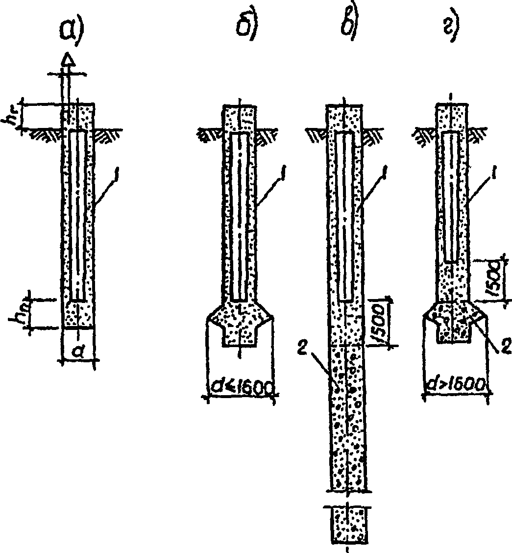 рис. 1 б). При диаметре уширения более 1,6 м оно должно быть заполнено бетоном литой консистенции или малоподвижной бетонной смесью, уплотненной глубинными вибраторами, а ствол изготавливают из малоподвижной бетонной смеси, при этом нижний торец полости должен быть на 1,5 м выше начала уширения. Устройство уширения для набивных полых свай в песчаных грунтах следует выполнять в соответствии с