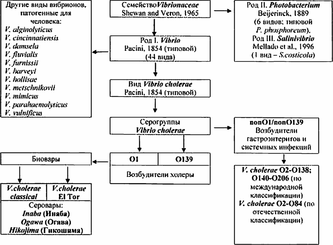 Примечание. Представители родов Aeromonas, Plesiomonas и Enhydrobacter исключены из семейства Vibrionaceae: порядок XII. Aeromonadales, семейство I. Aeromonadoceae, род I. Aeromonas Stanier, 1943 (14 видов); порядок XIII. Enterobacteriales, семейство I, Enterobacteriaceae, род XXVII, Plesiomonas Habs, Schubert, 1962 (I вид); порядок IX. Pseudomonadales, семейство III. Incertae Sedis, род I. Enhydrobacter Staley, Irgens, Brenner. 1987 (I вид).
