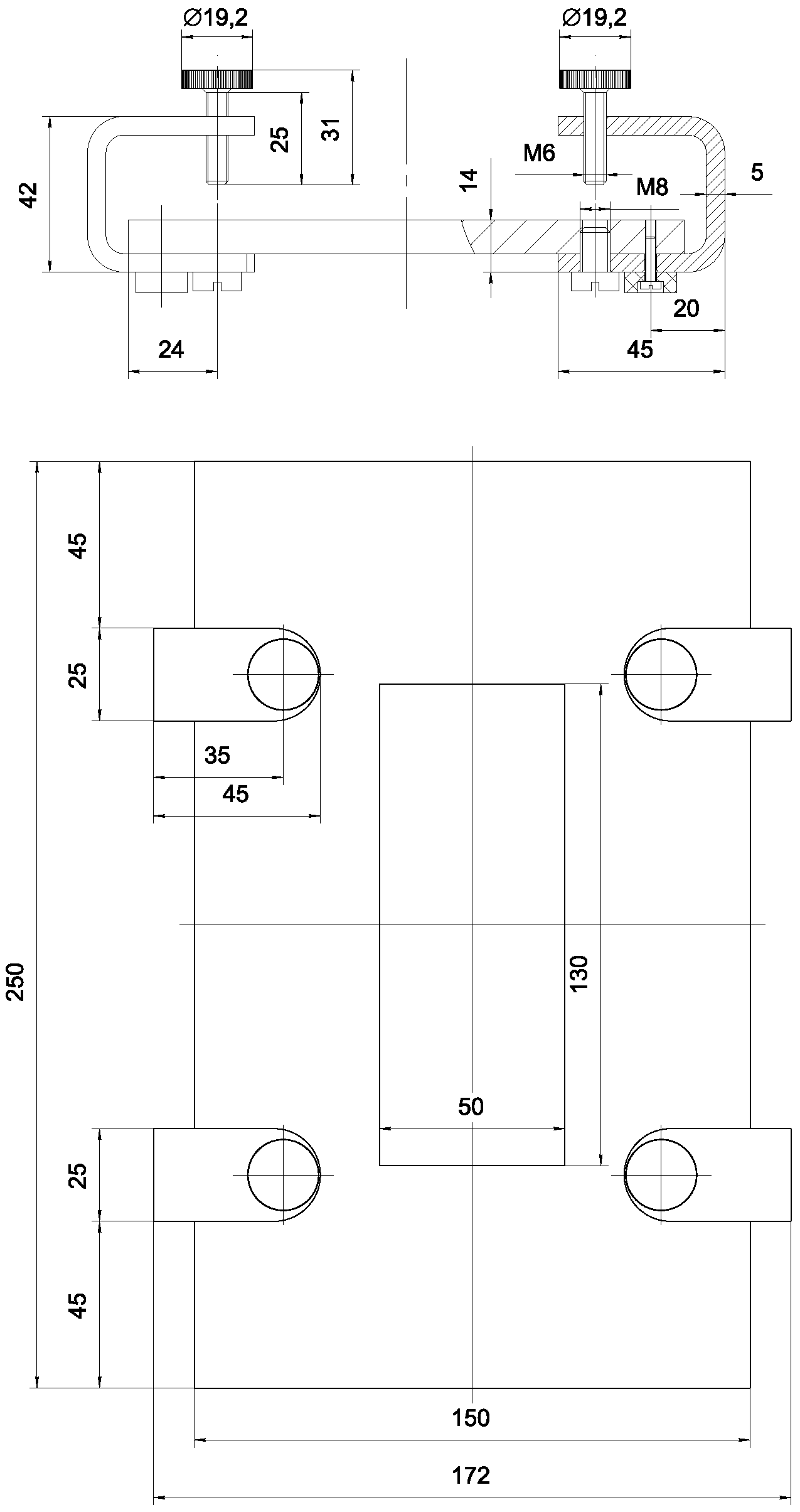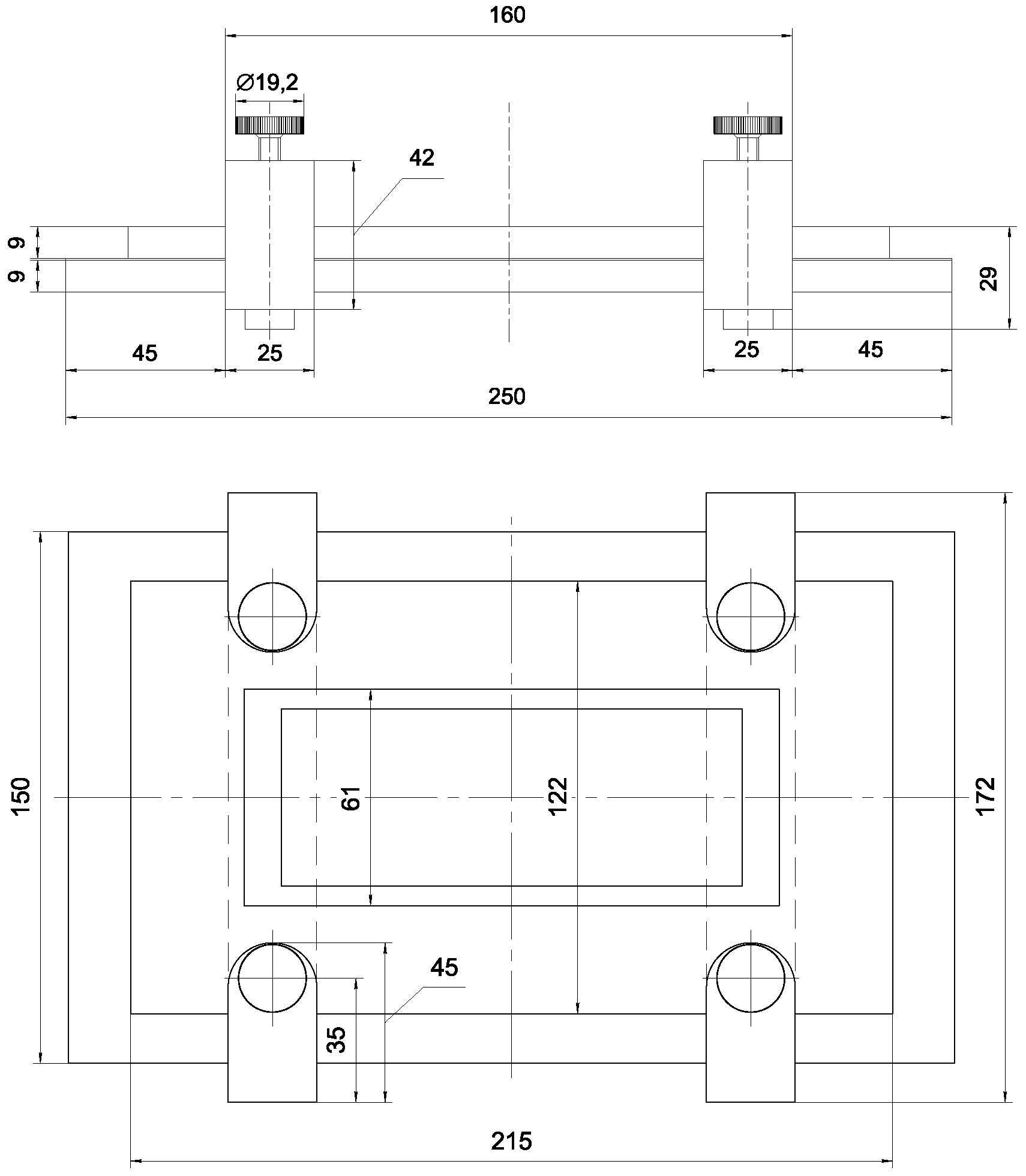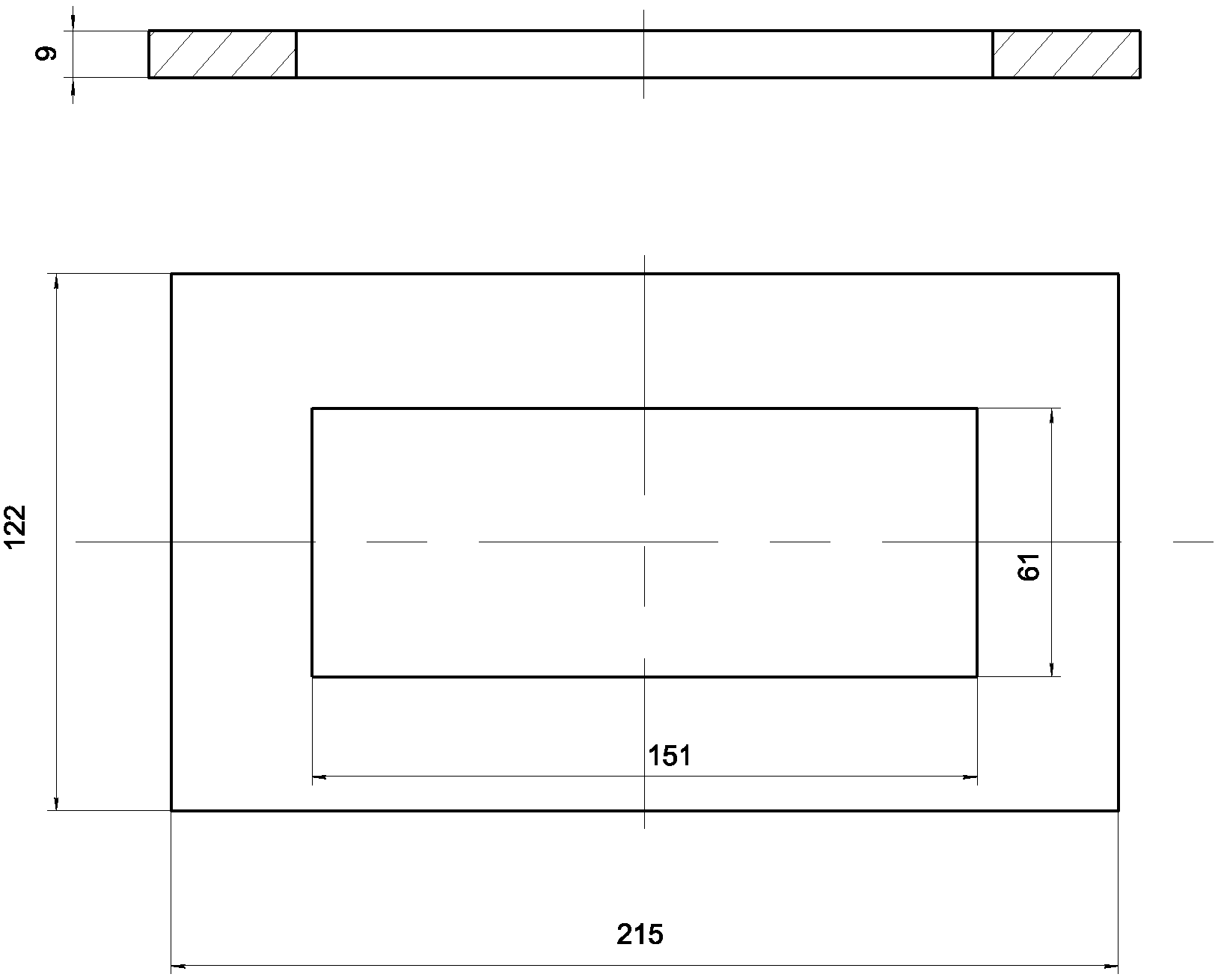 Подготовленную пластинку плотно зажимают между плитой и трафаретом при помощи рамки и упорных барашков и наносят на нее шпатлевку металлическим шпателем до краев трафарета, снимая избыток. Размер выреза в трафарете 50 x 130 мм.