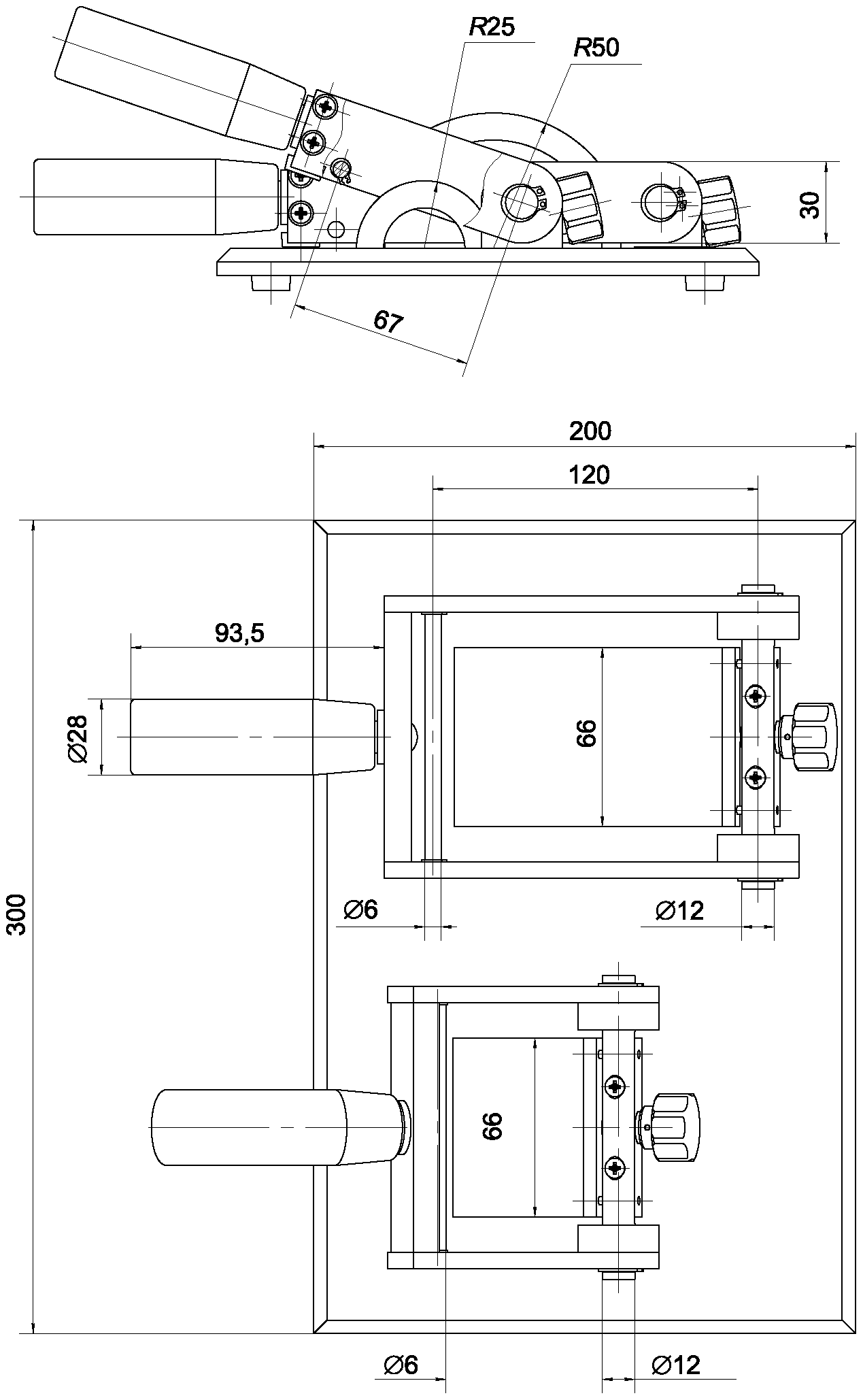 Прибор состоит из металлической плиты, к которой прикреплены полуцилиндры диаметром 100 и 50 мм, подвижной рамки с прижимным валиком для прижимания пластинки к цилиндрической поверхности, винта крепления и деревянной подставки.