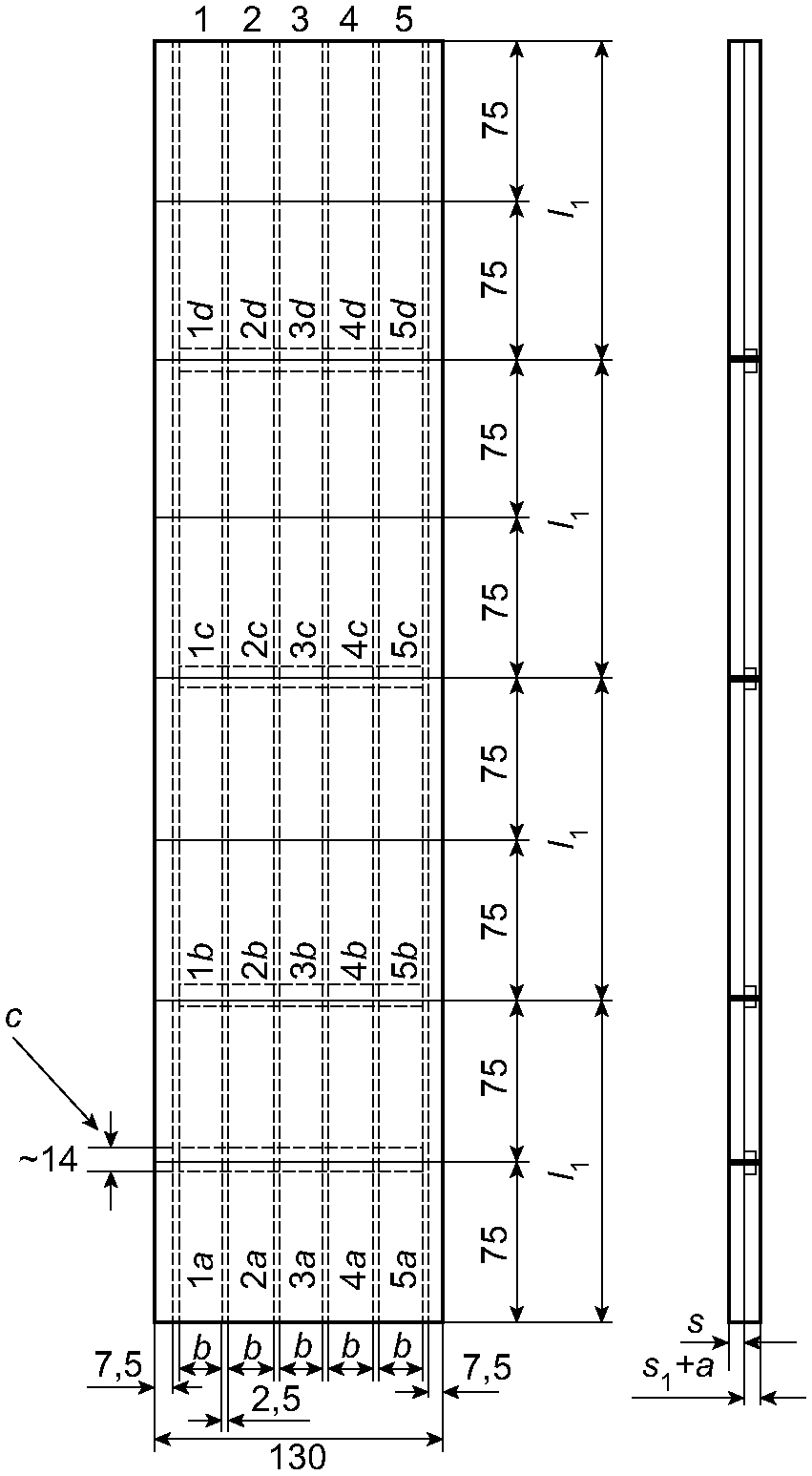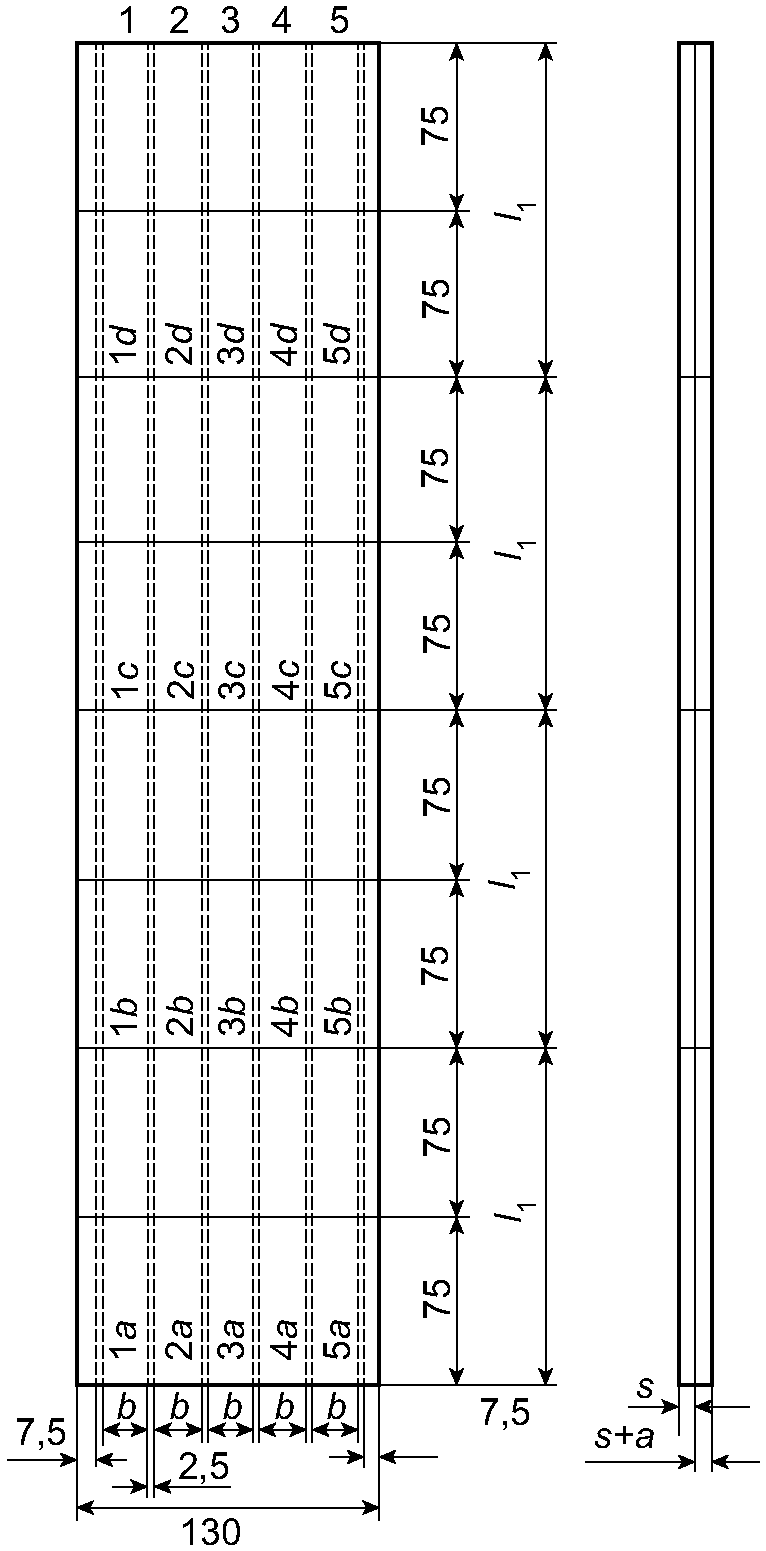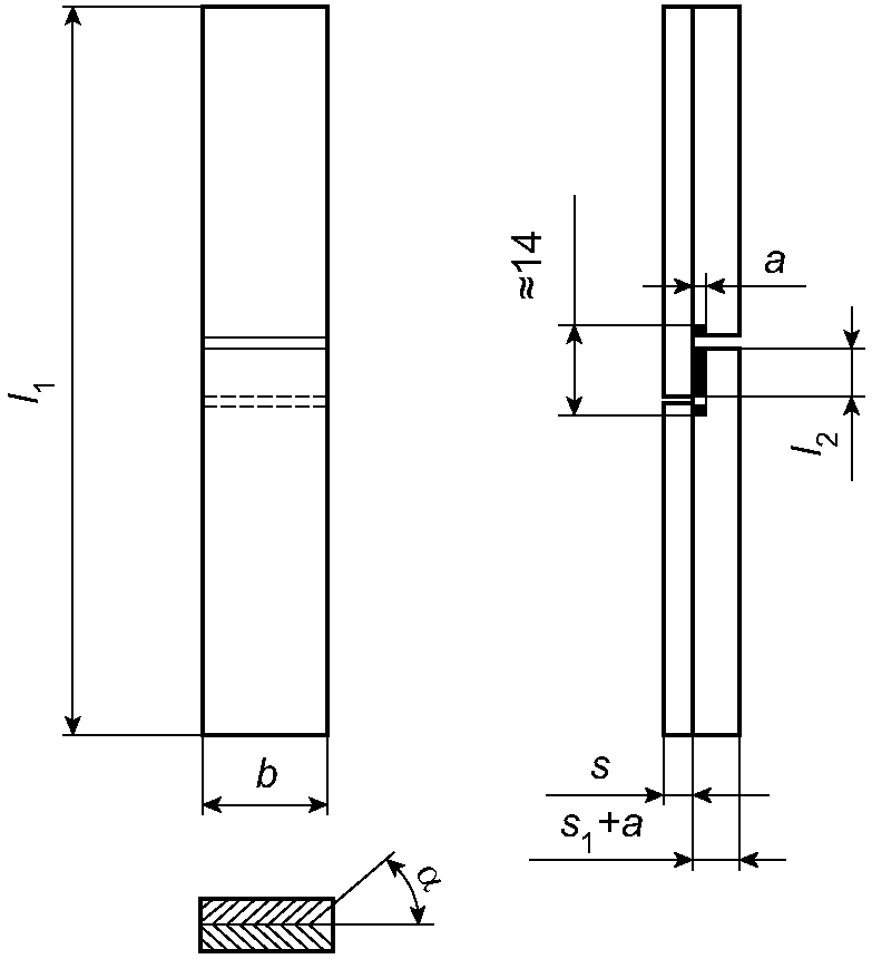 В заготовке толщиной 6 мм проделывают пазы глубиной (1,0 +/- 0,1) мм и шириной (14 +/- 1) мм, как показано на рисунке 1.