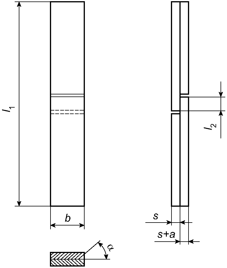 На каждом образце делают неглубокие пропилы шириной (2,5 +/- 0,5) мм на склеенных участках поперек волокон таким образцом, чтобы посередине определить склеенные в длину перекрытия внахлестку полосы l2 (10 +/- 0,2) мм, как показано на рисунке 2. Пропилы должны разделять склеенную область древесины. При этом обращают внимание на то, чтобы пропилы полностью перерезали клеевой шов, не затрагивая другую, не пропиливаемую часть клеевого соединения.