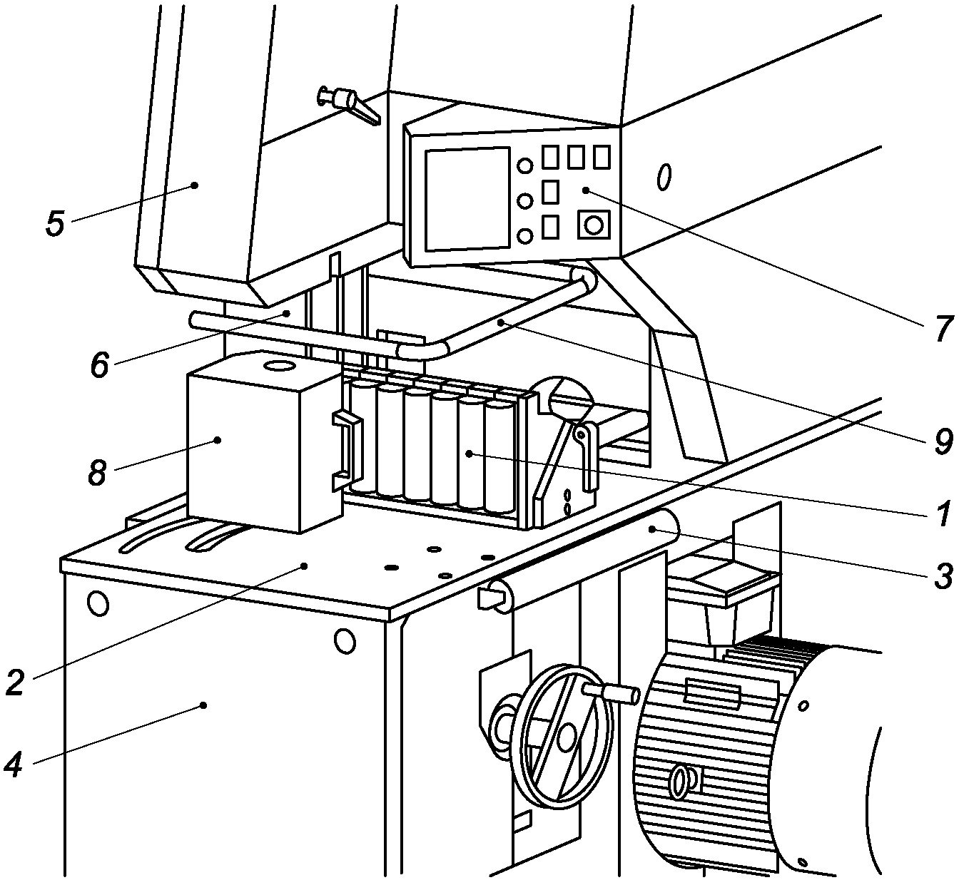 2 - стол станка; 3 - опорный валик; 4 - подстольное