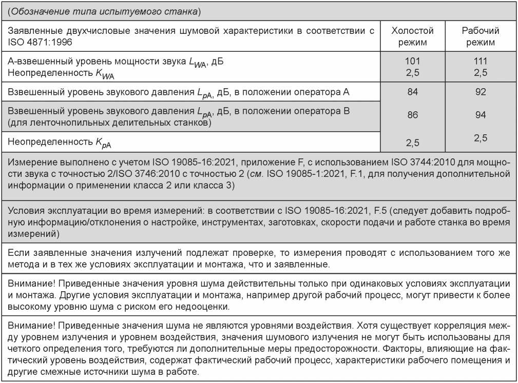 В таблице F.2 показан пример декларирования шумоизлучения для ленточнопильного столярного станка. Информация и значения шумового излучения, относящиеся к рассматриваемому станку, а также к рабочим условиям и используемым методам измерения, размещены в выделенных строках таблицы и приведены только для иллюстрации.