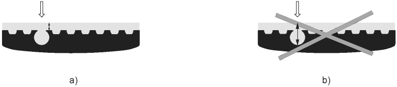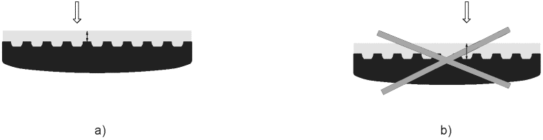 Измерения проводят вне открытых пор на древесине, см. a), лакокрасочный материал, который проник в открытые поры, не учитывается в расчетах, см. b).