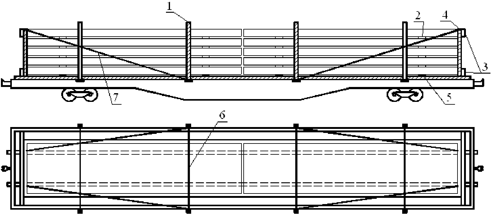 7.4 Закрепление плит при перевозке проводят с помощью стоек и связевых поперечных брусков, закрепленных двумя парами растяжек из проволоки диаметром 6 мм в шесть нитей. Верхний и нижний поперечные бруски прибивают к стойкам, нижний брусок, кроме того, к полу платформы четырьмя гвоздями длиной не менее 150 мм, как показано на рисунке 3.