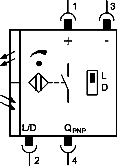a) диффузный отражающий фотоэлектрический сенсорный выключатель, регулировка потенциометра, вывод PNP, коммутация при функциях L/D (функция освещения/функция темноты) по сигналу управления на штыревой контакт 2, штекер с четырьмя контактными зажимами;