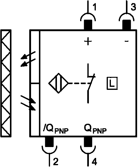 b) световозвращающий фотоэлектрический сенсорный выключатель, вывод PNP, коммутация при функции L (функция освещения), штекер с четырьмя контактными зажимами;