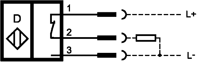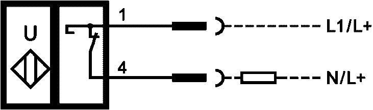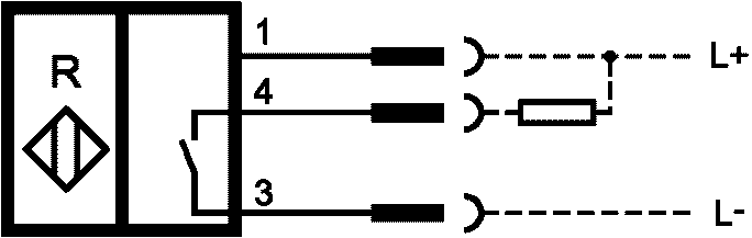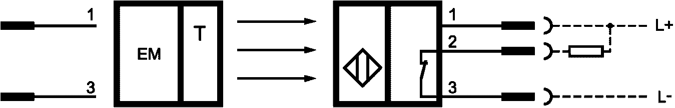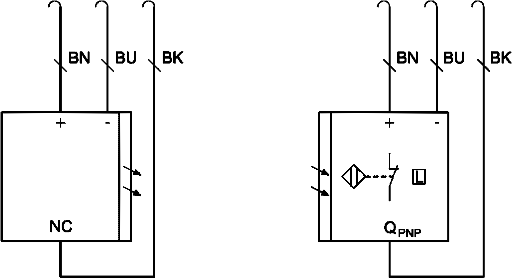 c) сквозной фотоэлектрический сенсорный выключатель (излучающее устройство - приемное устройство), вывод PNP, коммутация при функции L (функция освещения), обжимные кабельные наконечники.
