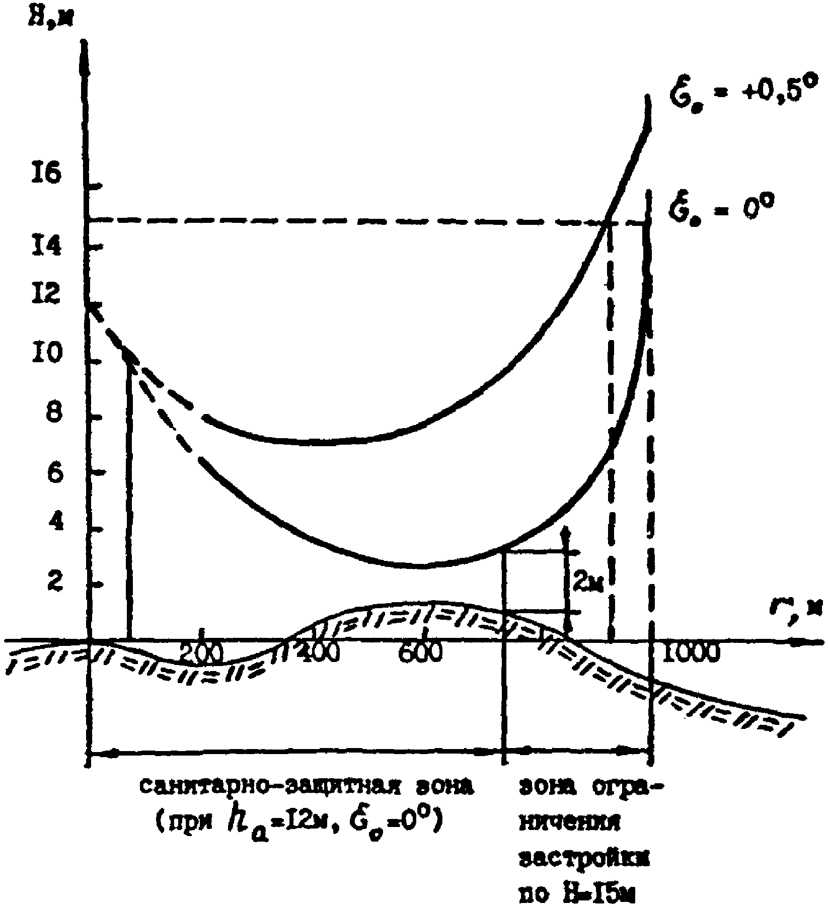 1) граница СЗЗ определяется на высоте H = 2 м; из точки H = 2 м проводим вертикальную прямую до пересечения с прямой, обозначенной заданной hа;