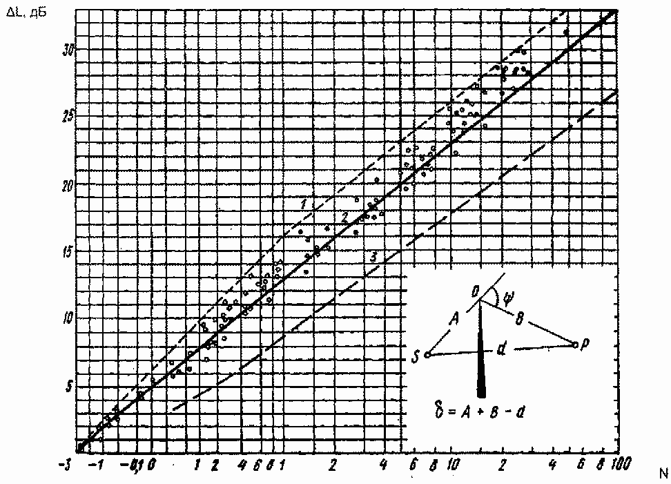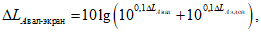 3.1 акустическая эффективность шумозащитного экрана, дБ: Величина, определяемая как разность уровней звукового давления (корректированных по A уровней звука или уровней звука A) в одной и той же точке наблюдения (расчетной точке) около защищаемого от шума объекта до и после установки шумозащитного экрана при той же шумовой характеристике источника шума.
