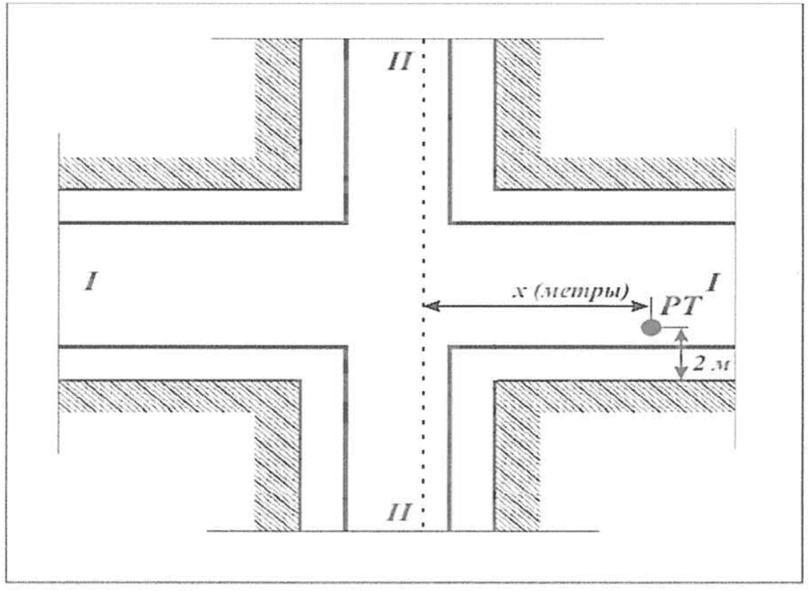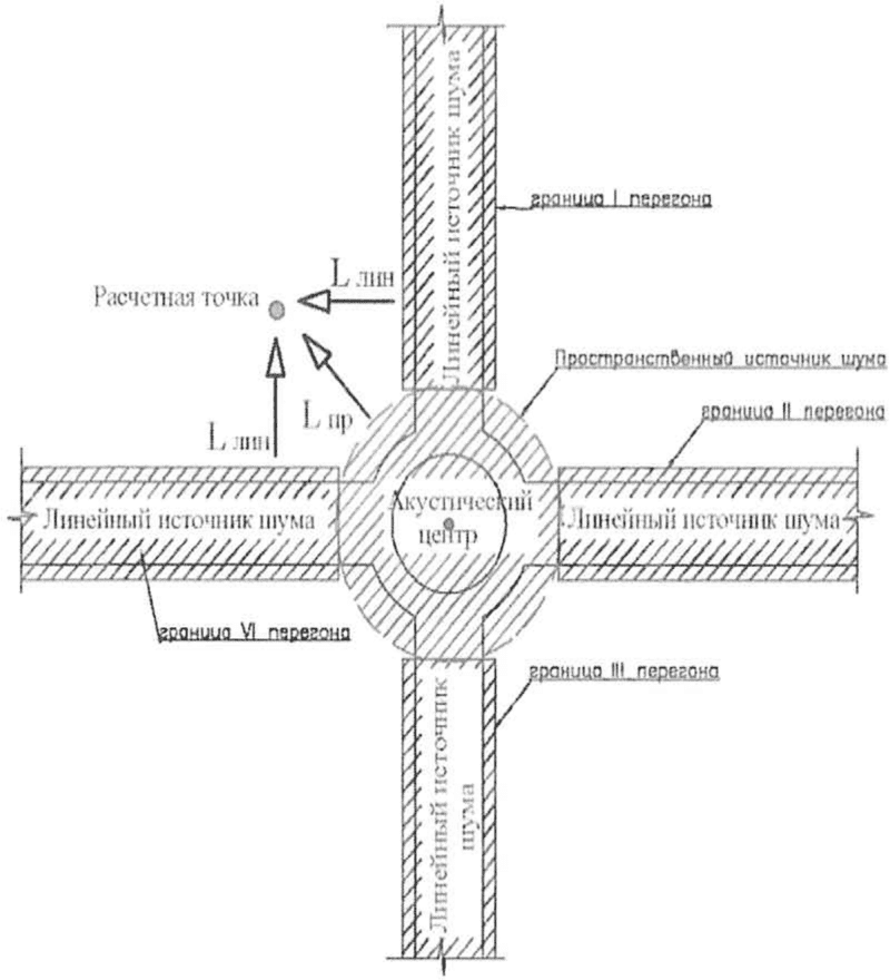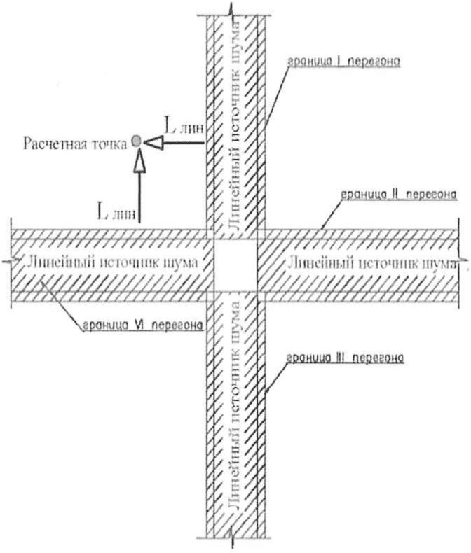 3.2 акустический центр транспортного потока: Условная точка для выполнения акустических расчетов уровней шума, производимого транспортным потоком. При определении шумовой характеристики транспортного потока и при исследовании распространения шума в открытом пространстве акустический центр транспортного потока принимают расположенным на высоте 1,0 м над уровнем проезжей части (для автомобильного транспорта) или над уровнем головки рельса (для рельсового транспорта, в том числе для высокоскоростного железнодорожного транспорта) и на оси ближней к точке наблюдения полосы движения автомобильного транспорта или на оси ближнего к точке наблюдения пути передвижения рельсового транспорта.