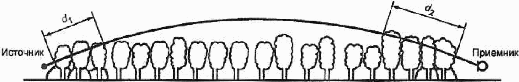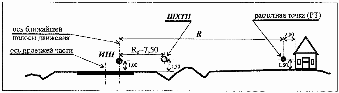 Примечание - При расчетах распространения шума при наличии шумозащитных сооружений акустический центр автотранспортного потока принимают расположенным на высоте 1,0 м над уровнем проезжей части (для автомобильного транспорта) или над уровнем головки рельса (для рельсового транспорта, в том числе для высокоскоростного железнодорожного транспорта) и на оси, наиболее удаленной от точки наблюдения полосы движения автотранспорта (для многополосных дорог), или на центральной оси двухполосных автодорог, или на оси наиболее удаленного от точки наблюдения главного пути передвижения железнодорожного транспорта.