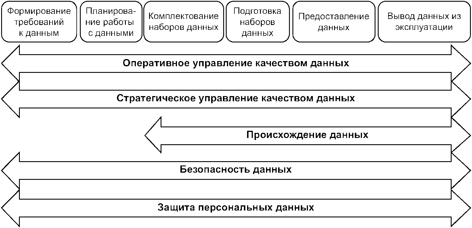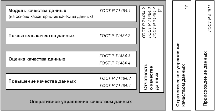 [1] описывает структуру стратегического управления качеством данных для аналитики и машинного обучения, дающую возможность органам стратегического управления организации направлять и контролировать внедрение и функционирование показателей обеспечения качества данных, оперативного управления качеством данных и связанных с ними процессов посредством использования адекватных мер контроля и управления в рамках описанной в настоящем стандарте модели жизненного цикла данных;