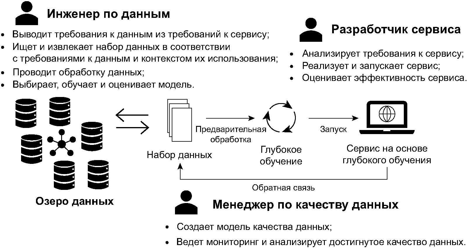 Описание | Компания стремится разработать сервис, который будет рекомендовать каждому пользователю персонализированную рекламу посредством использования глубокого обучения. Для этого: - шаг 1: (инженер по данным, разработчик сервиса) анализирует требования к сервису и выводит из них требования к данным; - шаг 2: (менеджер по качеству данных) создает модель качества данных в соответствии с требованиями к данным; - шаг 3: (инженер по данным) получает доступ к "озеру данных" и извлекает полезные данные в соответствии с требованиями к данным; - шаг 4: (инженер по данным) проводит обработку данных (включая повышение их качества), преобразуя их к форме, необходимой для глубокого обучения; - шаг 5: (инженер по данным) выбирает, обучает и оценивает модель; - шаг 6: (разработчик сервиса) реализует и запускает сервис, оценивает его эффективность. Опционально, с учетом измеренной эффективности сервиса, определяются дополнительные направления улучшения модели, и, исходя из этого, повторно выполняются шаги со 2 по 6 |