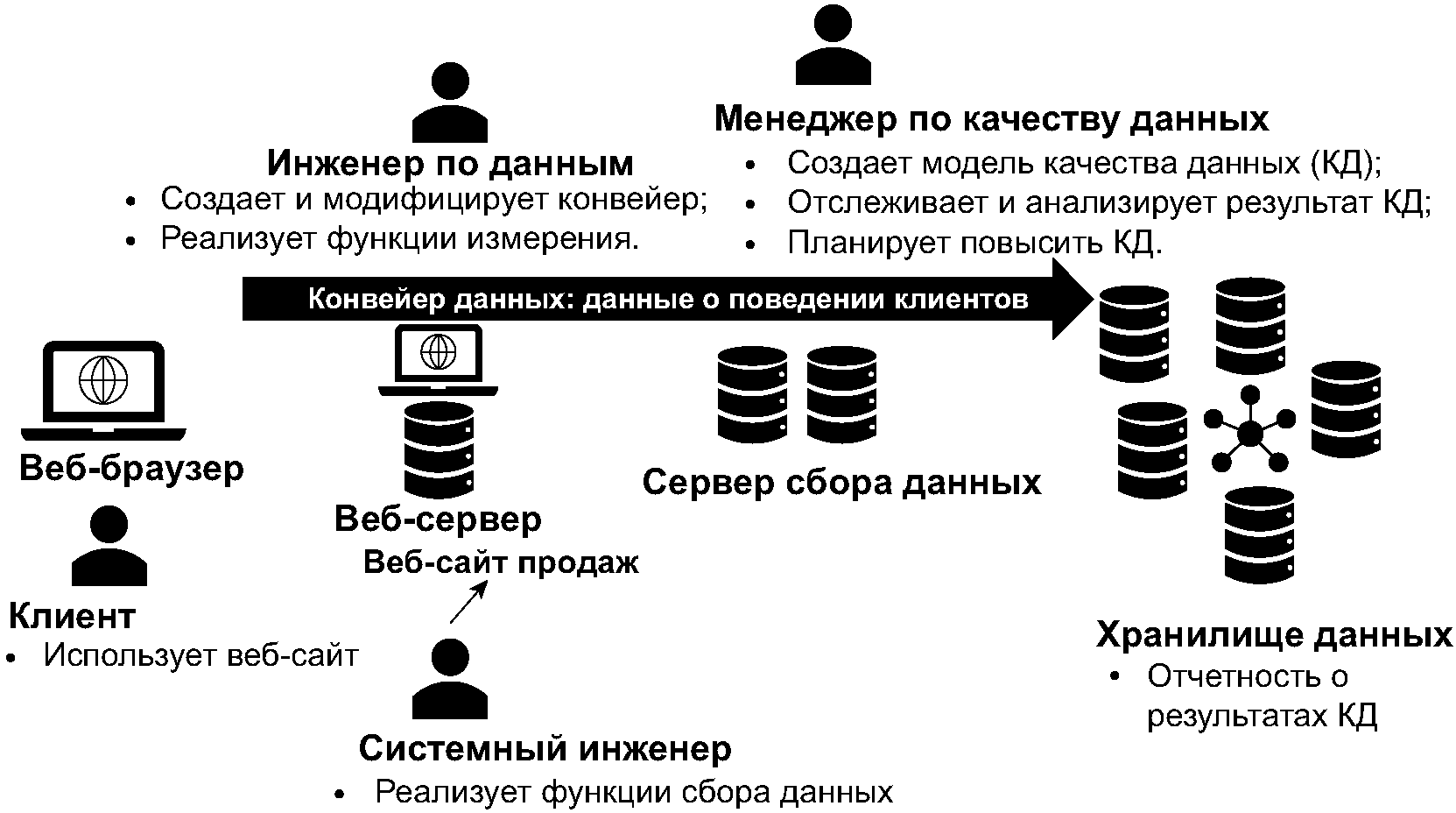 Описание | Компания, занимающаяся онлайн-продажами, планирует собирать на своем веб-сайте данные о закономерностях поведения клиентов и использовать их в маркетинговых целях. С этой целью создается конвейер данных для сбора данных о связанных с действиями клиентов событиях и их размещения в хранилище данных. Эти данные затем используются для различного рода анализа. Для этого: - шаг 1: (системный инженер) реализует функции сбора данных о событиях, связанных с клиентом; - шаг 2: (менеджер по качеству данных) создает универсальную модель качества данных для собранного набора данных; - шаг 3: (инженер по данным) создает конвейер для предварительной обработки данных, включающей очистку данных, ETL-обработку (от англ. extract, transform, load - "извлечение, преобразование, загрузка"); сегментацию данных в блоки по времени и размещение их в хранилище данных; - шаг 4: (менеджер по качеству данных, инженер по данным) реализует функции измерения для каждой характеристики качества данных на основе модели качества данных, созданной на шаге 2, и добавляет эти функции в конвейер; - шаг 5: (хранилище данных, система управления качеством данных) сообщает о результатах оценки качества набора данных; - шаг 6: если оцененное качество данных не удовлетворяет требованиям, то (менеджер по качеству данных) анализирует причину и предлагает план по повышение качества данных; - шаг 7: (инженер по данным) модифицирует конвейер данных во исполнение плана, разработанного на шаге 6; - шаг 8: когда качество данных достигает желаемого уровня, (инженер по данным) завершает конвейер данных. Таким образом, шаги 1 - 8 будут при необходимости повторяться, пока качество данных не достигнет желаемого уровня, после чего данный цикл будет завершен |