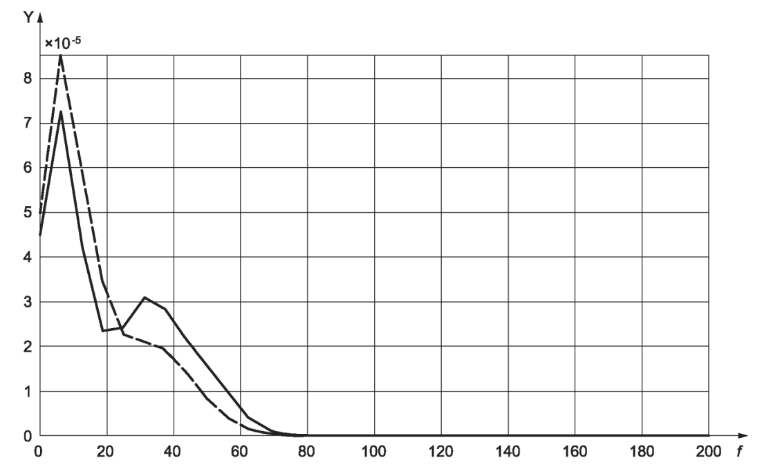 (штриховая линия) сигналов ускорения, (м/с2)2/Гц;