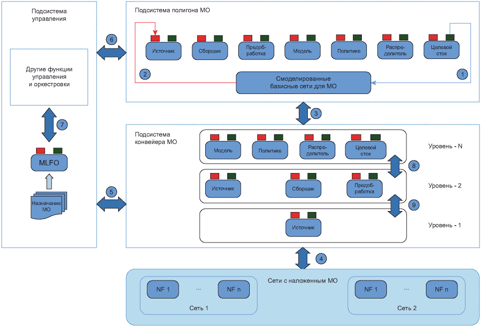 Полигон МО | | Данная подсистема создает возможность обучения, оценки и мониторинга производительности моделей МО перед их развертыванием в реальной сети. Она взаимодействует с базисными сетями для МО для передачи данных или обученных моделей. Кроме того, в ней используются моделируемые базисные сети для МО, которые могут генерировать данные, необходимые для обучения моделей МО |