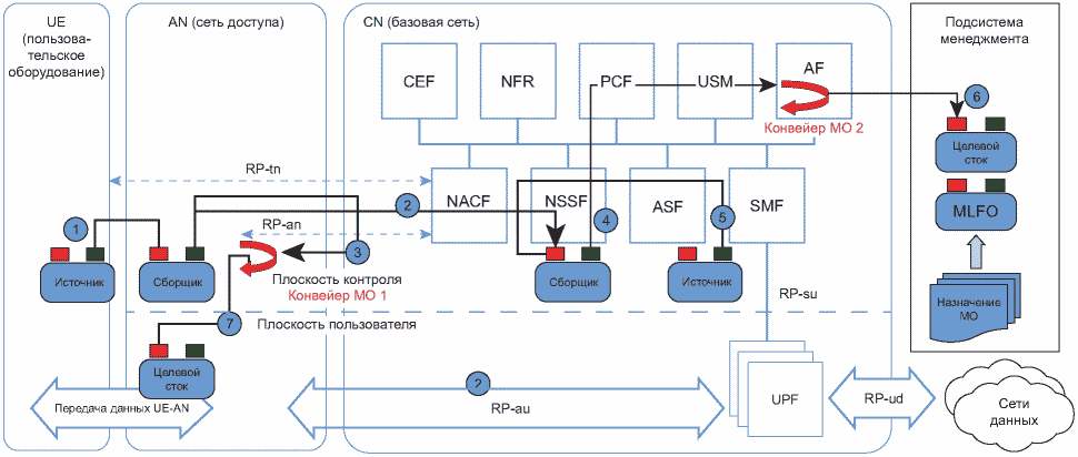 - взаимодействие приложения МО с сетевыми функциями в базисной сети для МО: для приложения МО существует две точки специфического взаимодействия с сетевыми функциями в базисной сети для МО - узлы с источниками и целевыми стоками. Узлы с источниками могут иметь как основанный на SBA (сервис-ориентированная архитектура) интерфейс к сетевым функциям (производящим данные), так и не поддерживающий SBA интерфейс к сетевым функциям, зависящим от конкретной технологии. Подобным образом узлы с целевыми стоками могут иметь как основанный на SBA интерфейс к связанным с ним сетевым функциям (обеспечивающим исполнение выходных политик МО), так и не поддерживающий SBA интерфейс к сетевым функциям, зависящим от конкретной технологии;