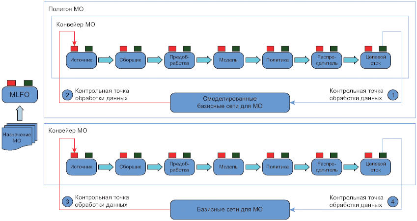 - контрольная точка между подсистемой конвейеров МО и подсистемой полигона МО позволяет конвейерам МО взаимодействовать с подсистемой полигона МО для обучения и обновления моделей МО;