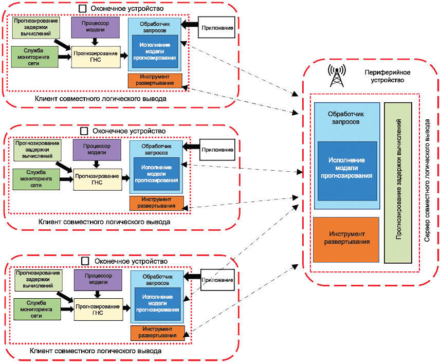 рисунке 1 демонстрирует взаимодействие многочисленных оконечных устройств с периферийным устройством, имеющим ограниченные ресурсы. Для каждого оконечного устройства нужно принять решение о разделении в соответствии с вычислительными возможностями оконечных устройств и выделенными периферийными ресурсами. Если вычислительных возможностей оконечного устройства достаточно, то его модель ГНС не разделяется и не занимает ресурсы периферийного устройства, при этом вся модель ГНС полностью исполняется на оконечном устройстве. Если же вычислительных возможностей оконечного устройства недостаточно, то его модель ГНС будет разделена и совместно исполняться оконечным и периферийным устройствами.