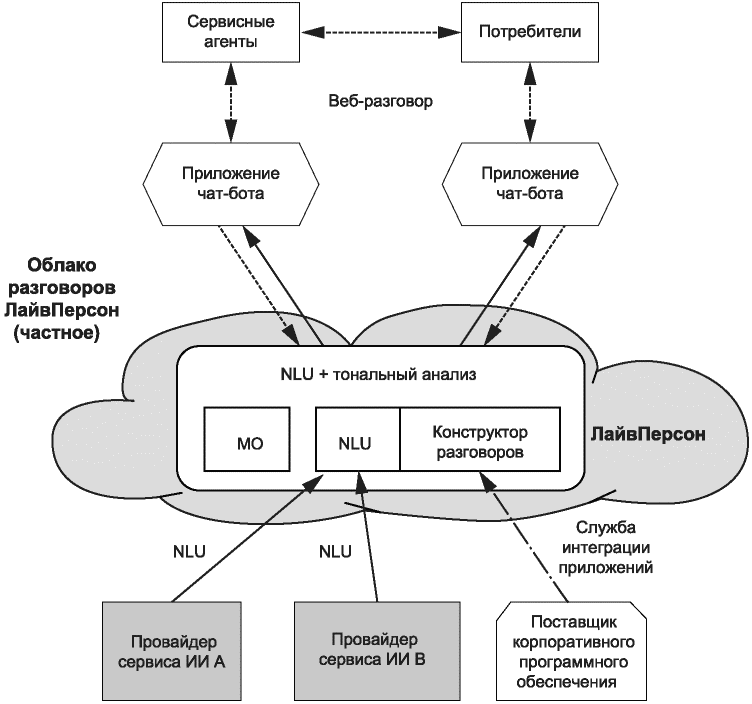 На рисунке A.1 показаны компоненты приложения ЛайвПерсон на основе ИИ в его среде. В приложении используют интегрированные возможности обработки естественного языка и распознавания тональности высказывания для построения диалога в чатах с пользователями онлайн. Приложение также сохраняет данные этих диалогов для использования в машинном обучении как часть непрерывного совершенствования системы.