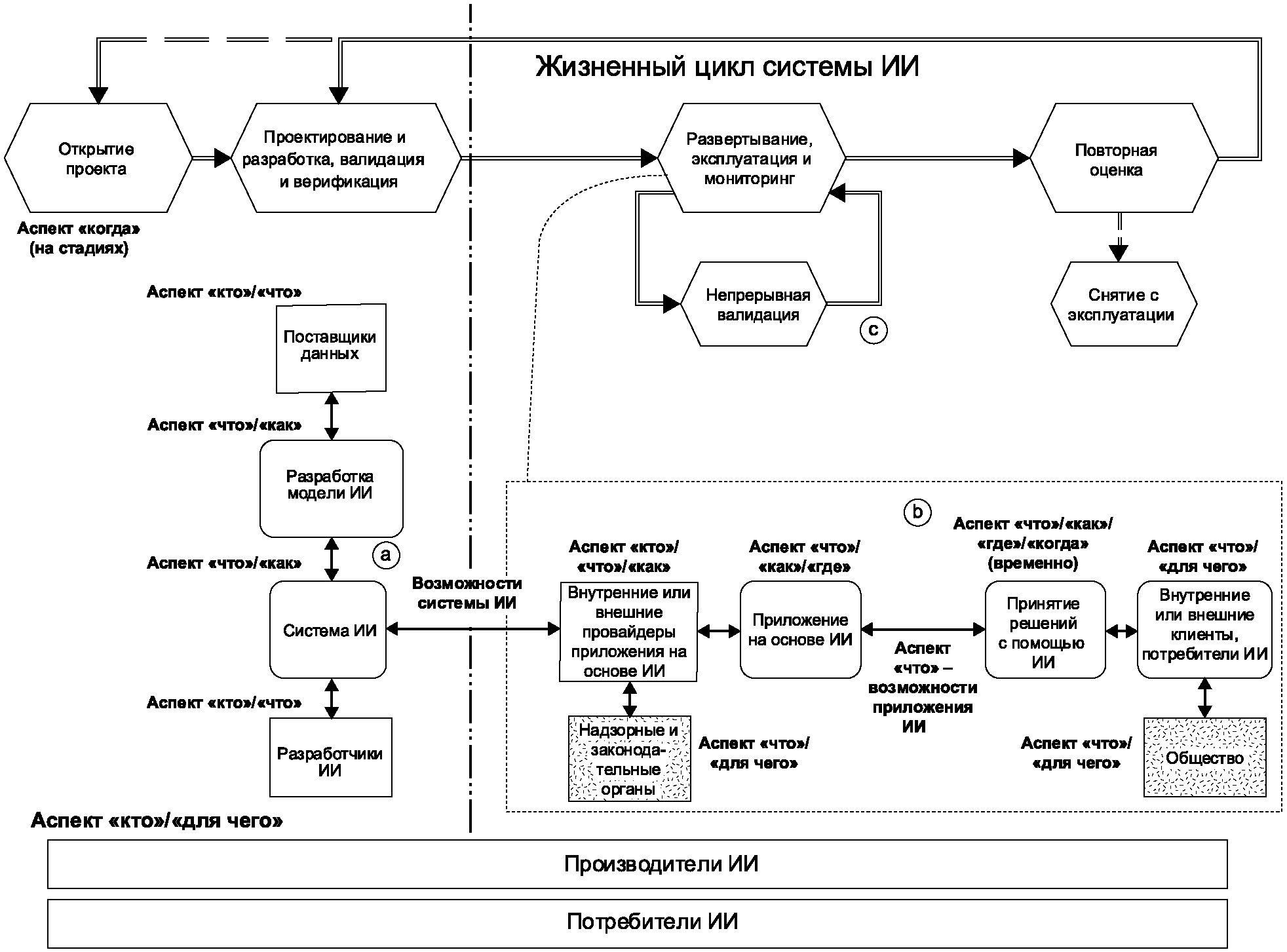 На рисунке 1 показан типичный контекст применения ИИ с заинтересованными сторонами, процессами и взаимосвязями с различными стадиями жизненного цикла системы ИИ.