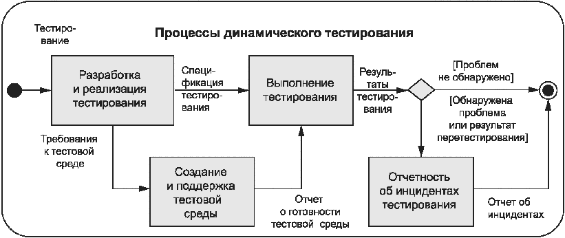 Процессы динамического тестирования описывают разработку тестовых примеров, настройку тестовой среды, выполнение тестовых примеров и отчет о возникших проблемах. Взаимодействие процессов динамического тестирования показано на