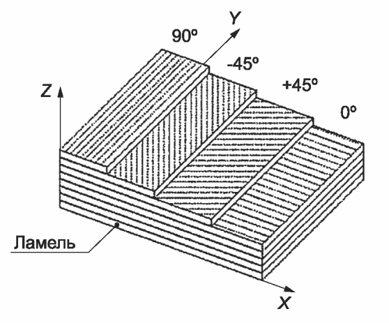 ламель: Монослой многослойного полимерного композита, армированный одним видом армирующего наполнителя - ровингом, кордной тканью, тканью, мультиаксиальной тканью или матом. Примечание - В зависимости от вида армирующего наполнителя ламель является однонаправленно-, двунаправленно-, многонаправленно- или хаотичноармированной. |