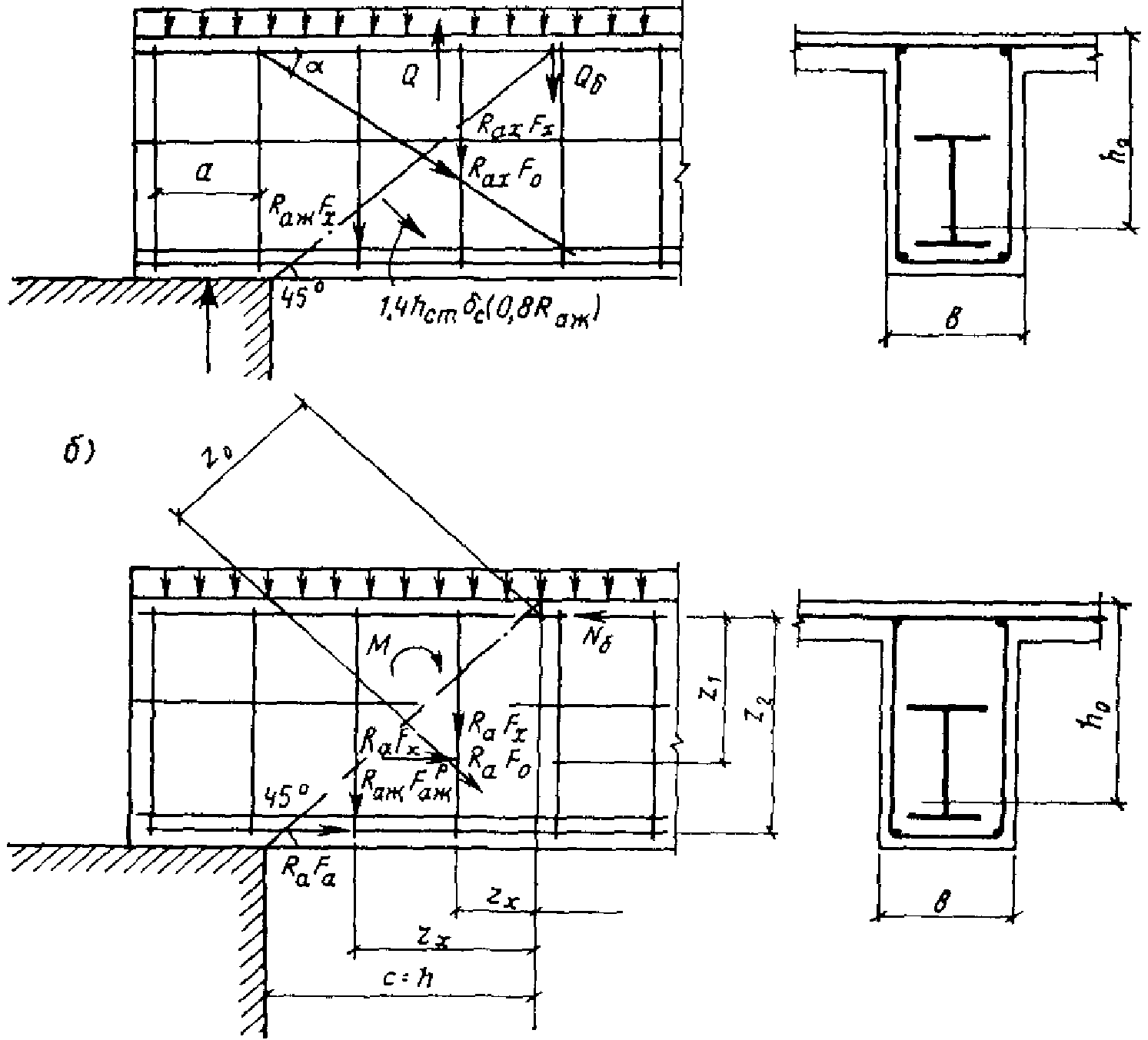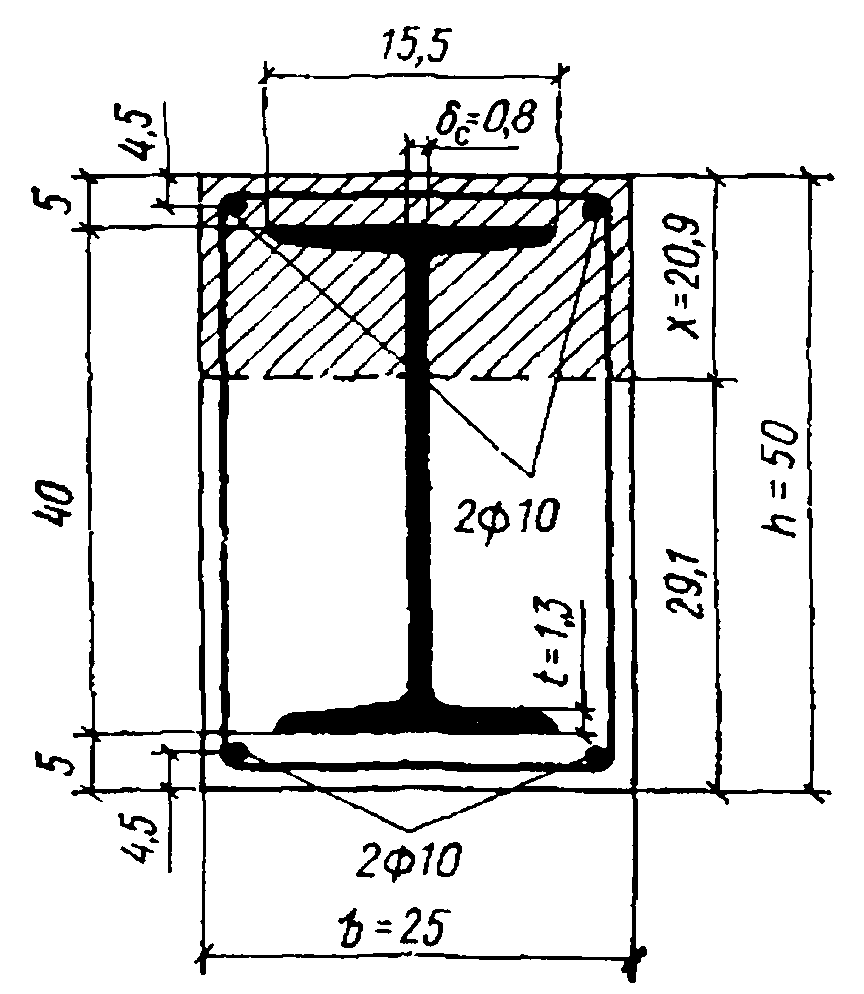 3.2. Расчет по прочности железобетонных элементов с жесткой арматурой производится для сечений, нормальных к их продольной оси, а также для наклонных к ней сечений под углом 45°; при наличии крутящих моментов не учитывается работа жесткой арматуры на кручение.