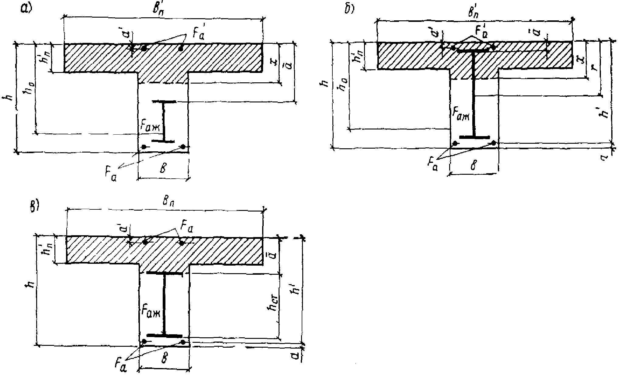 - площади сечений полок профилей жесткой арматуры, расположенных соответственно в растянутой и сжатой зоне;